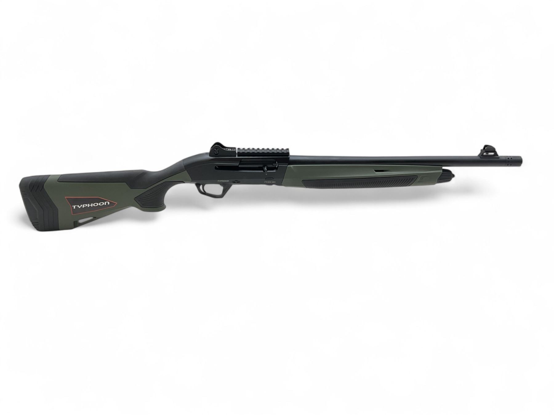 Typhoon PH0ENIX Semi Auto Shotgun 12Ga 3" Chamber 18.5" Barrel Green And Black, New. Comes with a removable extended choke. Adjustable front and rear sight. Receiver drilled and tapped with rail installed. This is a non-restricted firearm.