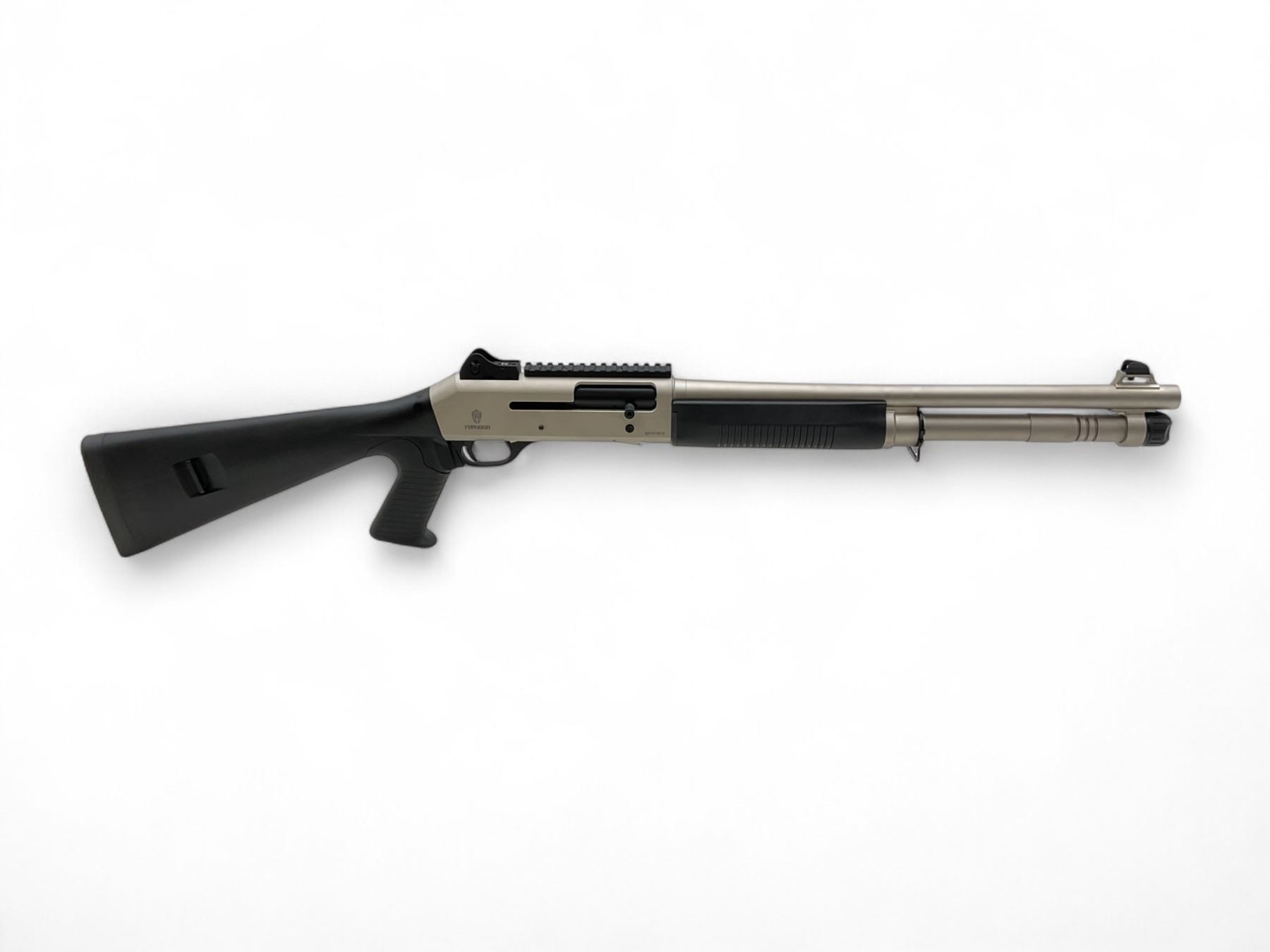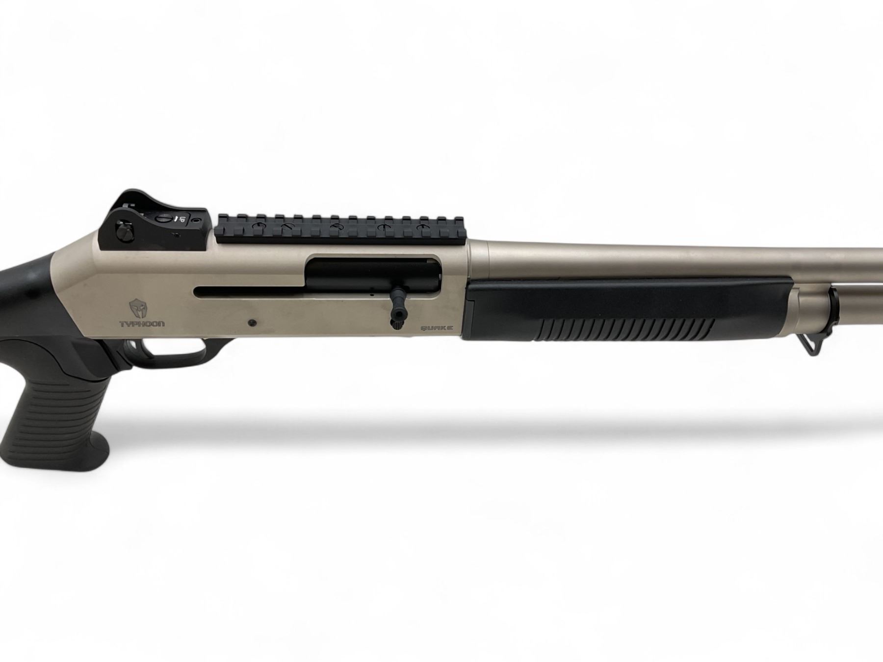 Typhoon QUAKE Semi Auto Shotgun 12Ga 3" Chamber 18.5" Barrel Silver And Black, New. Comes with a removable choke. Fixed front sight, adjustable rear sight. Receiver drilled and tapped with rail installed. This is a non-restricted firearm.