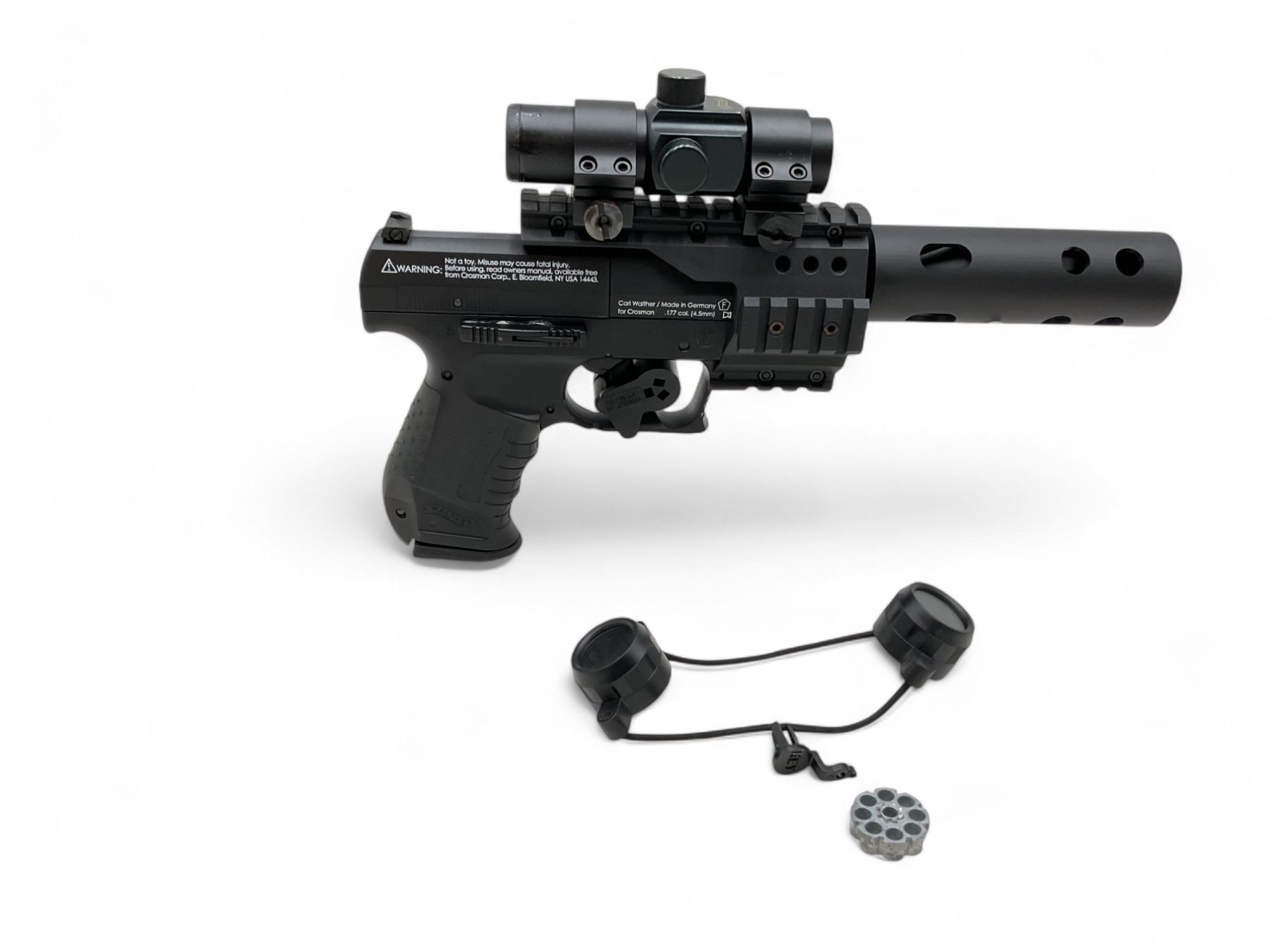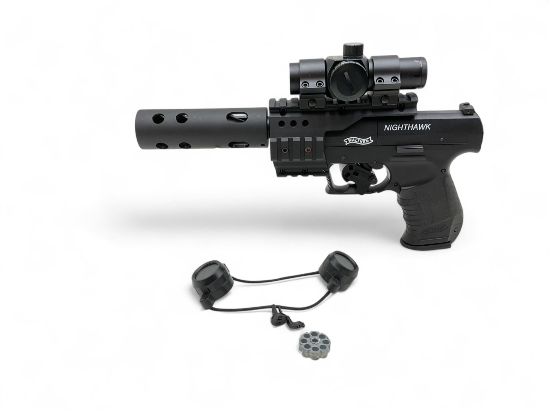 Umarex Walther Nighthawk CO2 Air Pistol .177 Caliber Pellet Pistol With Walther Red Dot. Untested. Comes with plastic case. You must be over 18 years of age to purchase this item.