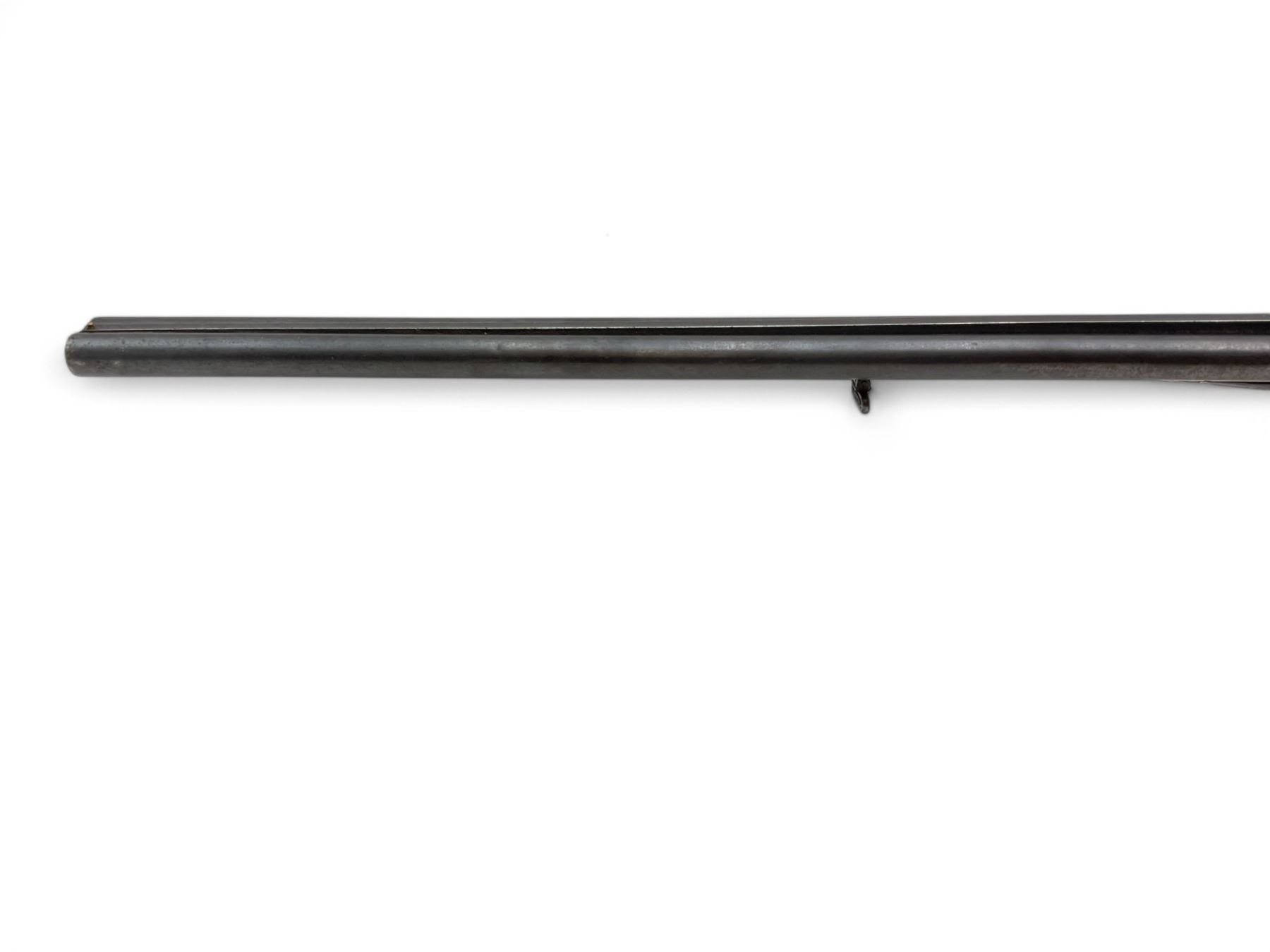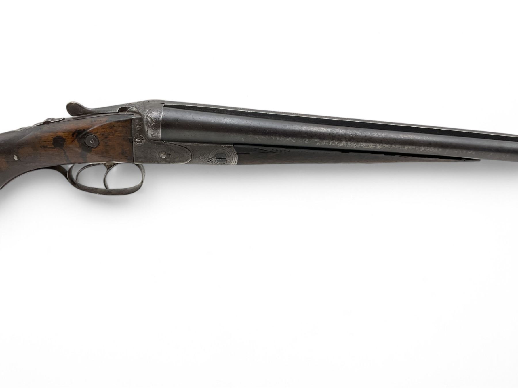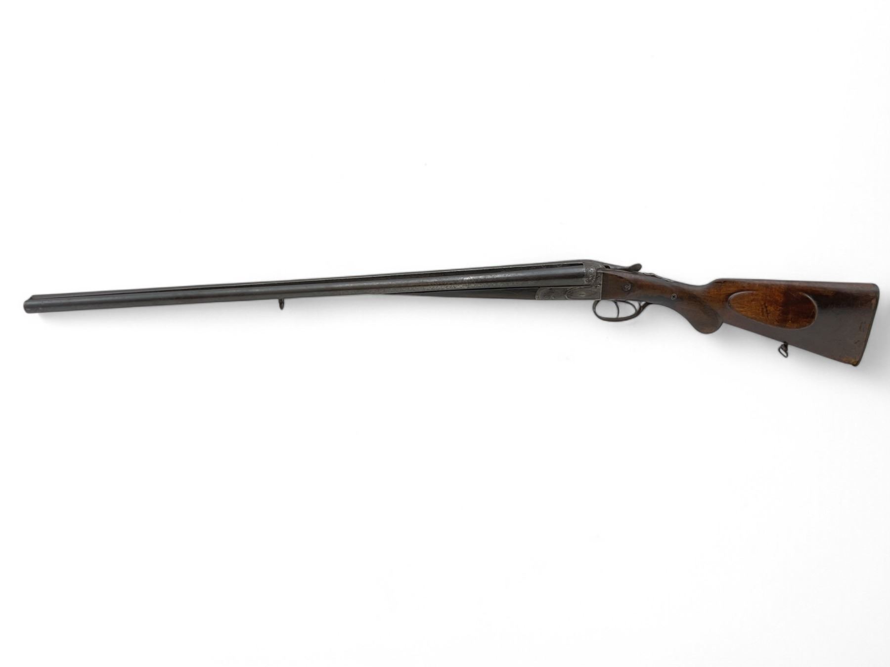 Unknown German Side By Side Shotgun 16Ga 30" Barrels Wood Stock. Wood forend is cracked; rear stock is cracked and has been repaired. Bead sight; fixed chokes. Double triggers. Finish shows signs of corrosion. This is a non-restricted firearm.