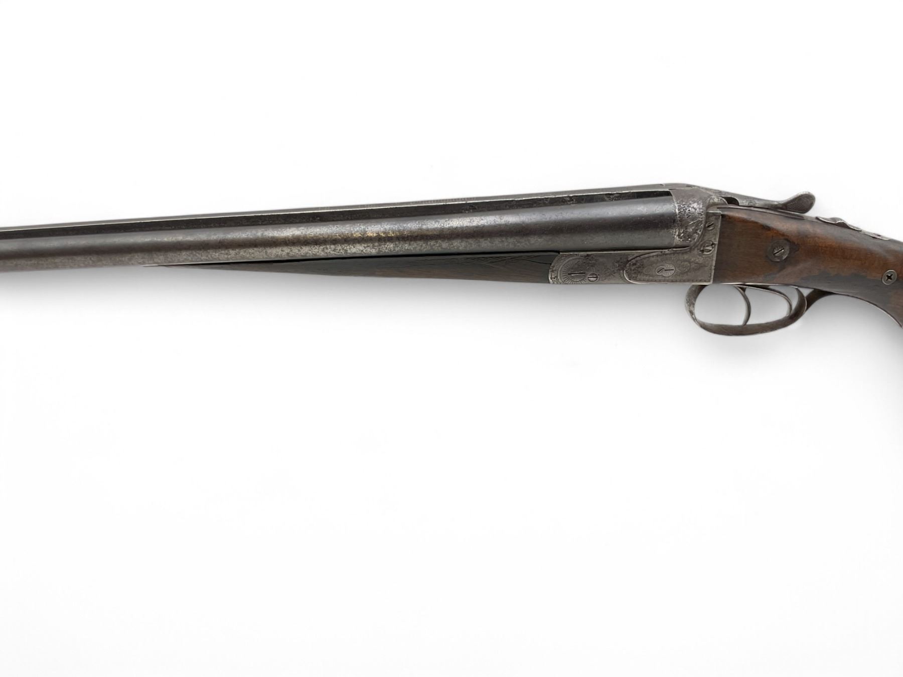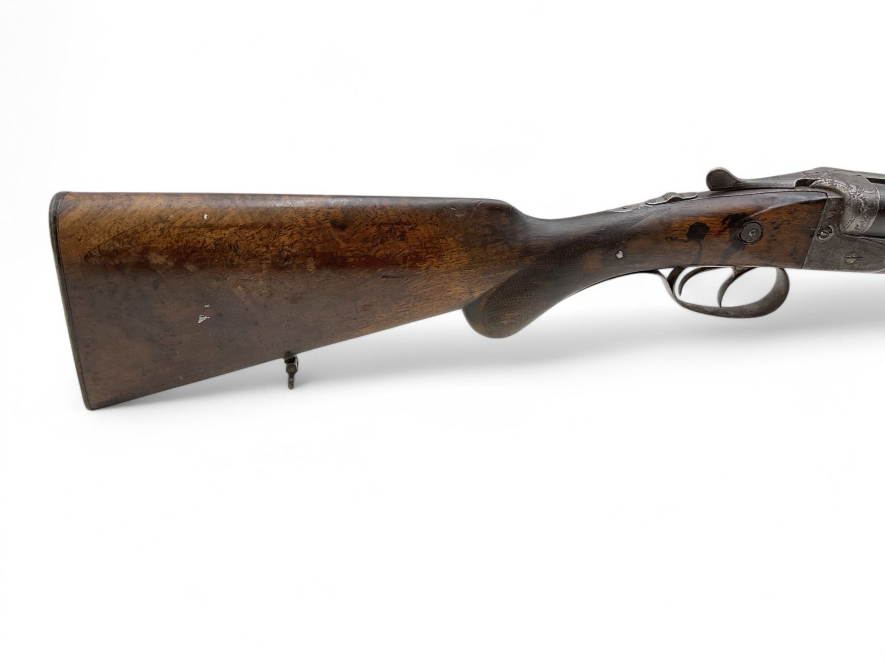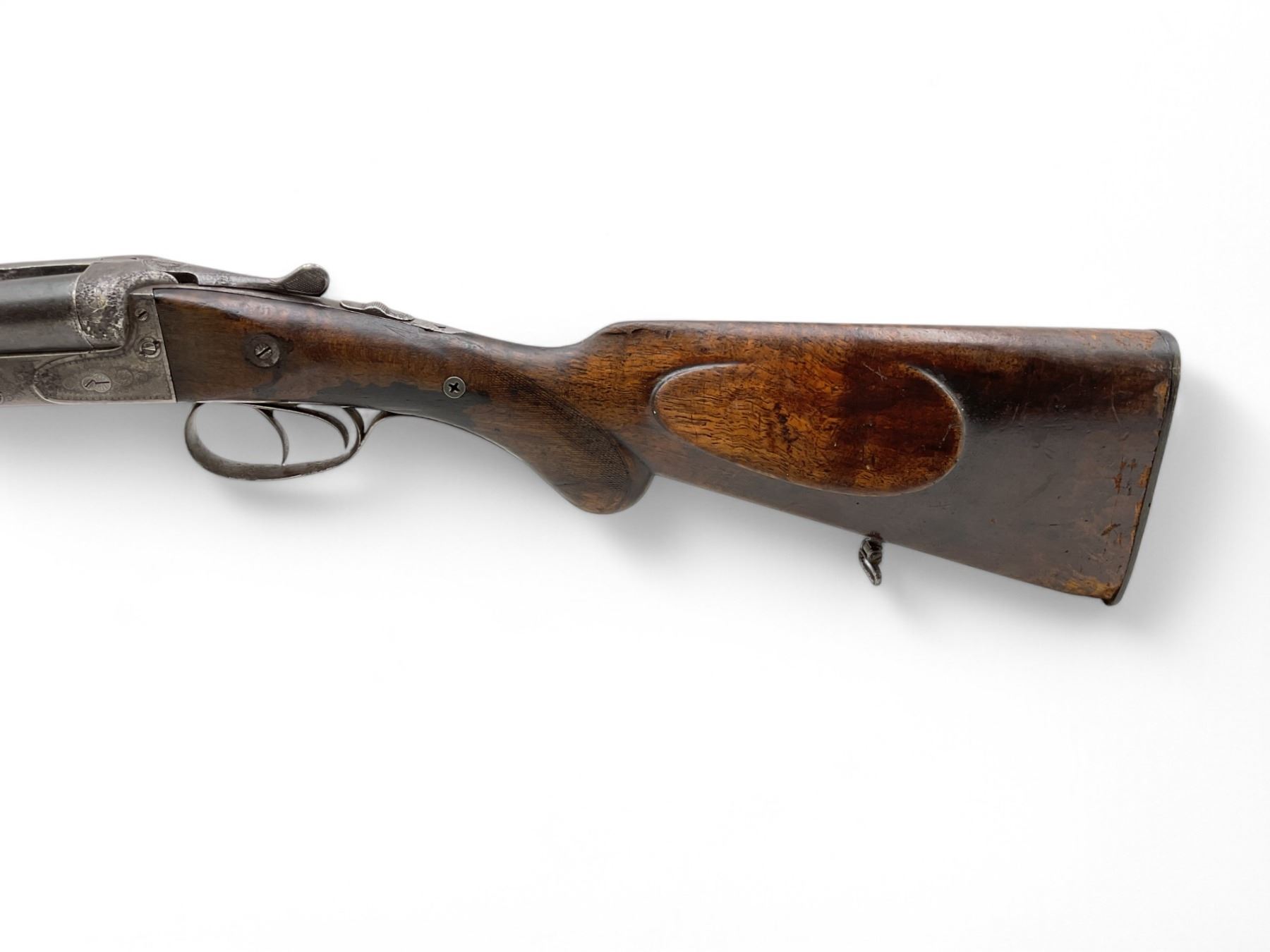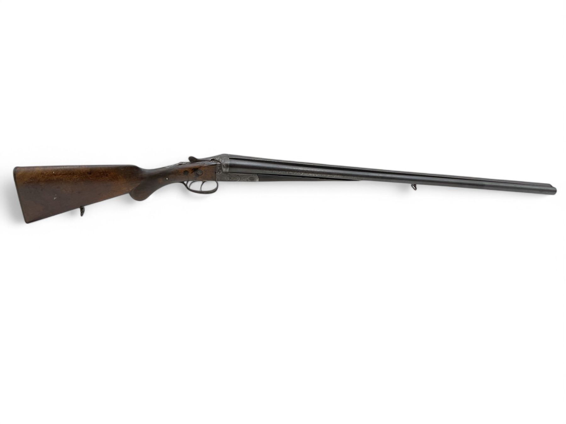 Unknown German Side By Side Shotgun 16Ga 30" Barrels Wood Stock. Wood forend is cracked; rear stock is cracked and has been repaired. Bead sight; fixed chokes. Double triggers. Finish shows signs of corrosion. This is a non-restricted firearm.