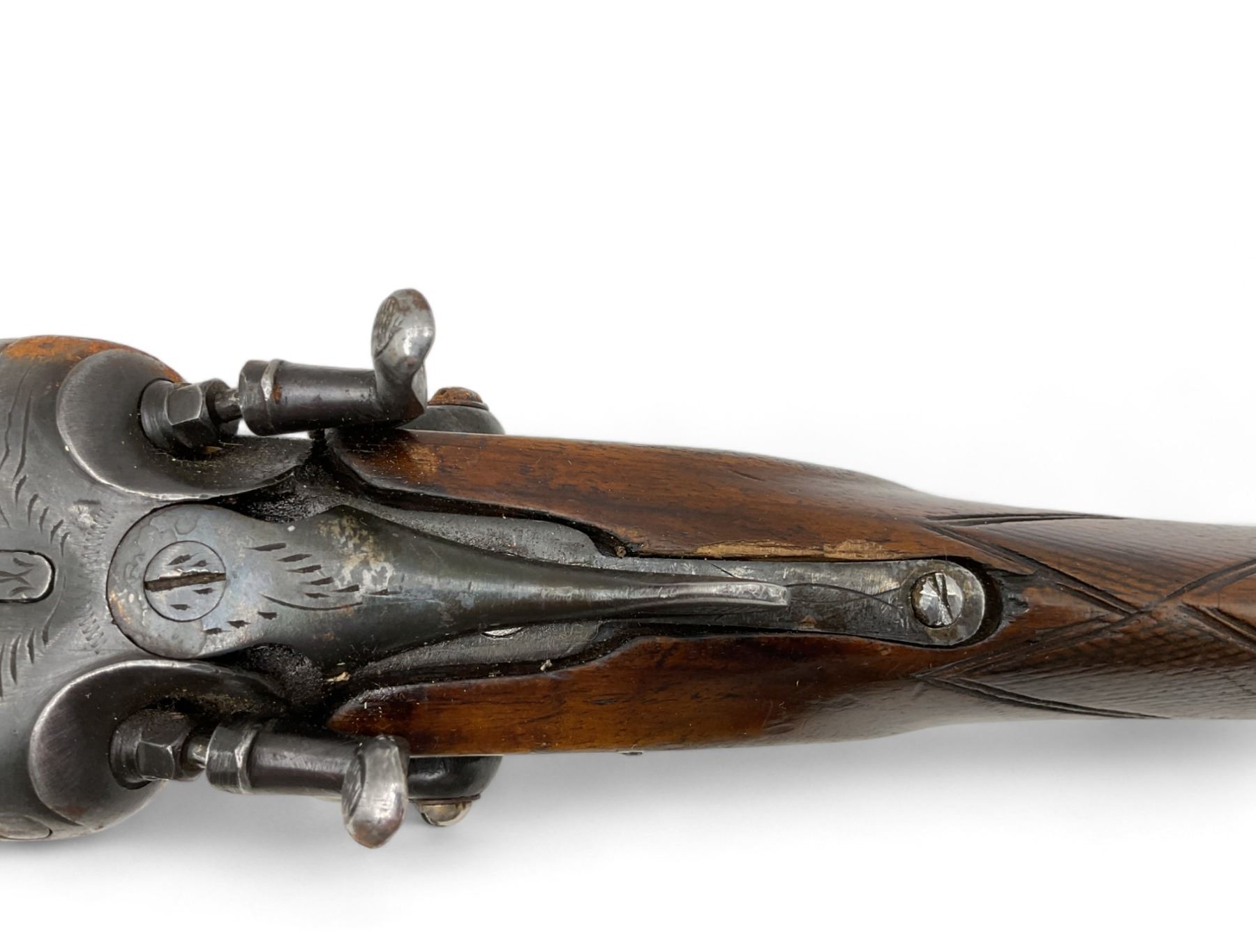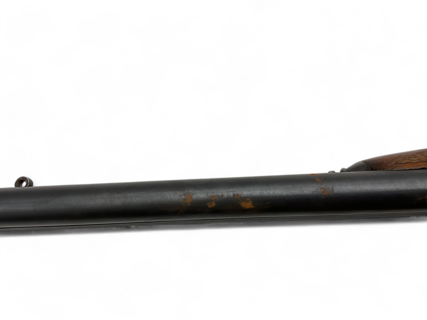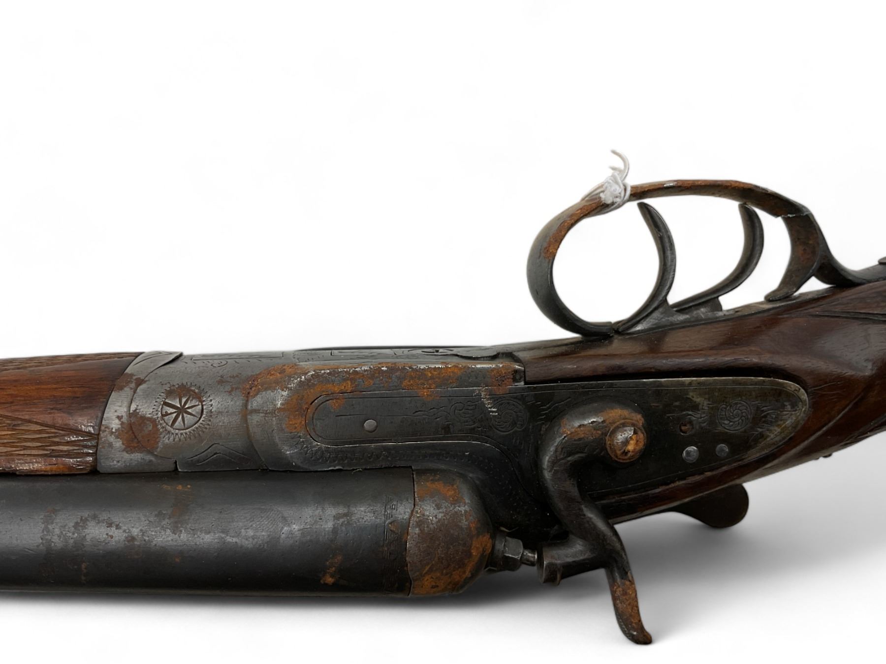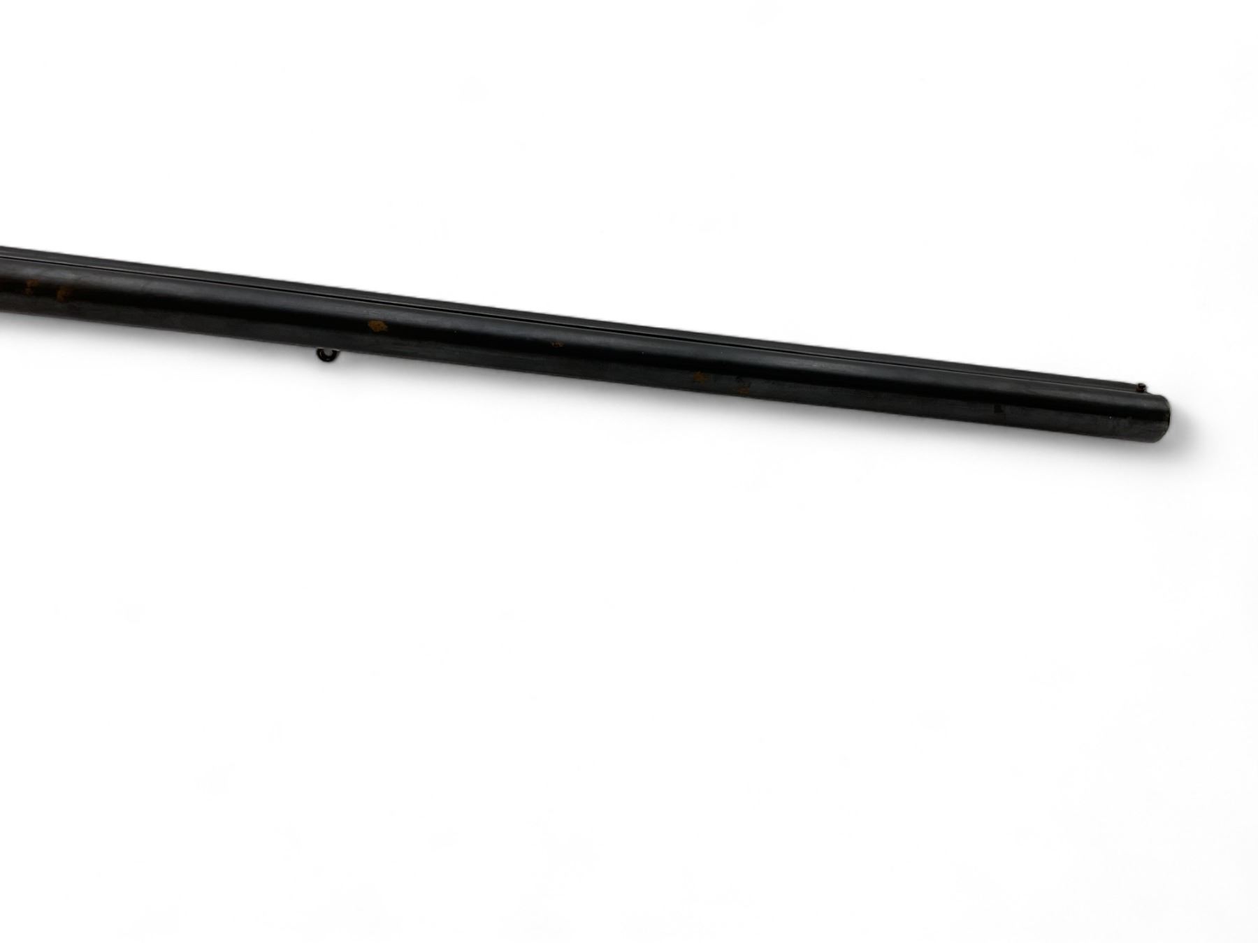 Unknown Side By Side Shotgun 12Ga 30" Barrels Wood Stock. Bead sight, fixed chokes. Exposed double hammers and double triggers. Rear stock appears to have been replaced; replacement stock does not fit correctly. This is a non-restricted firearm.