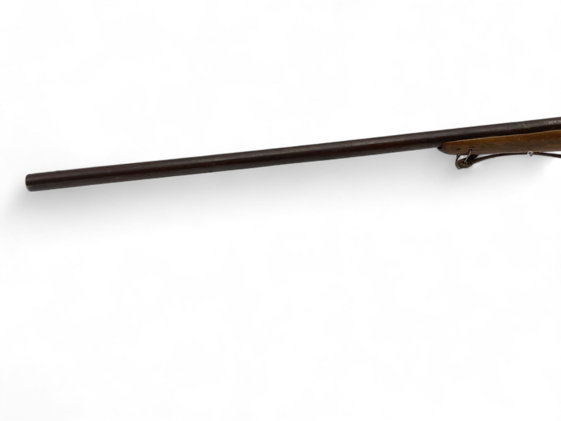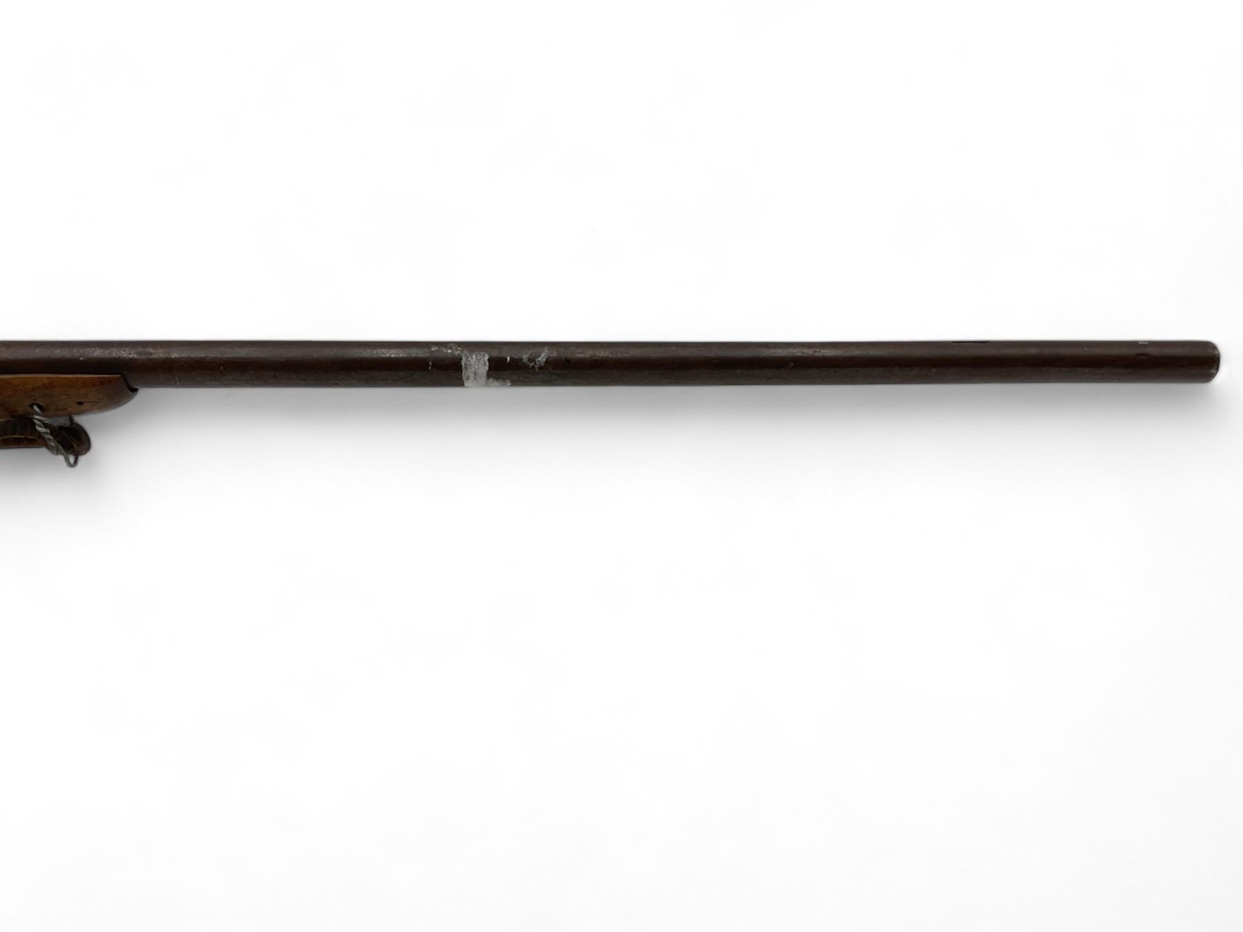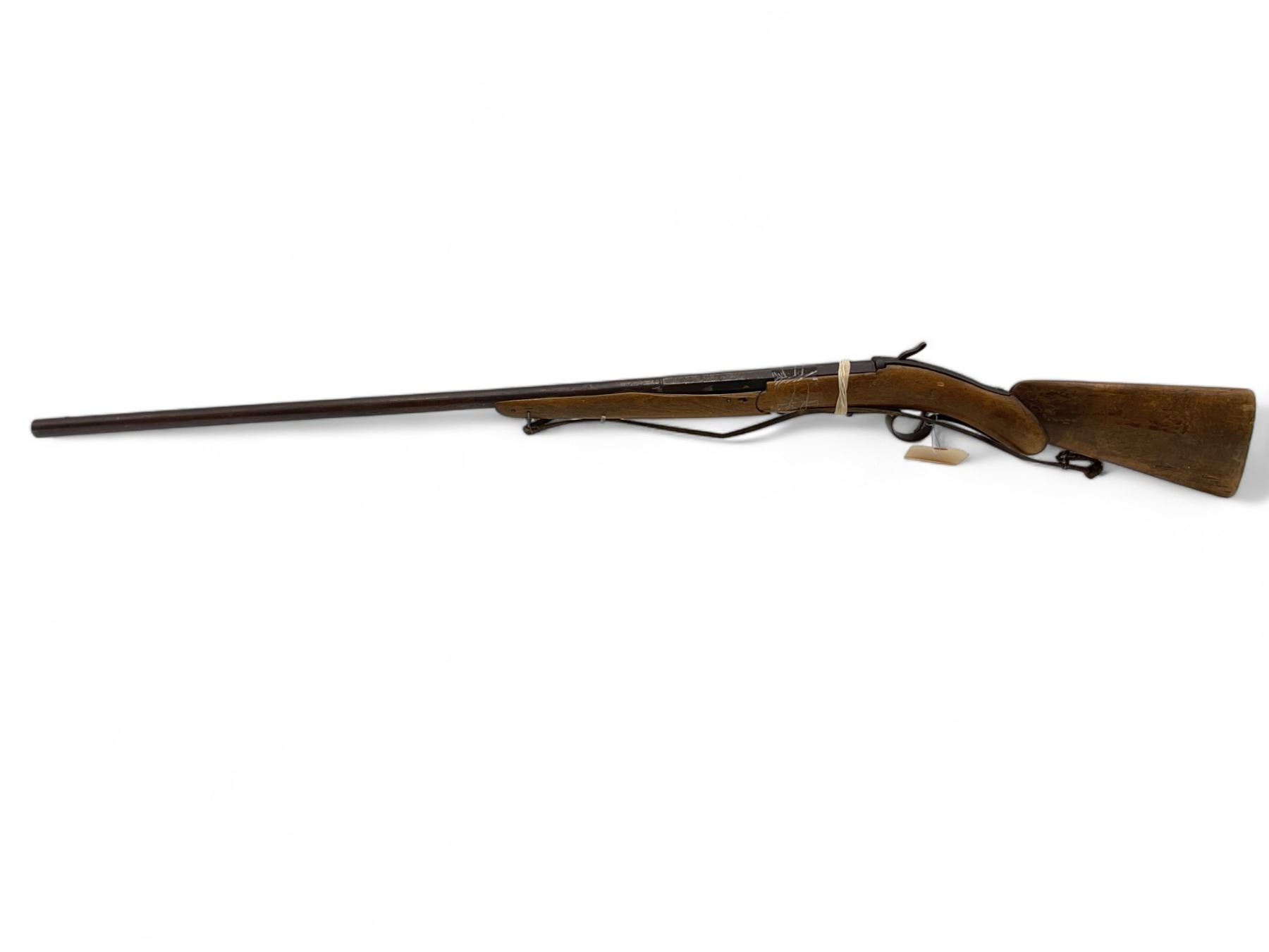 Unknown Single Shot Shotgun 28Ga 33" Barrel Wood Stock. Fixed choke, no sight. Wood forend and stock cracked and broken. Action does not lock shut; catch mechanism appears to be broken and missing parts. Trigger guard broken and welded; bottom metal bent and missing hardware. This is a non-restricted firearm.