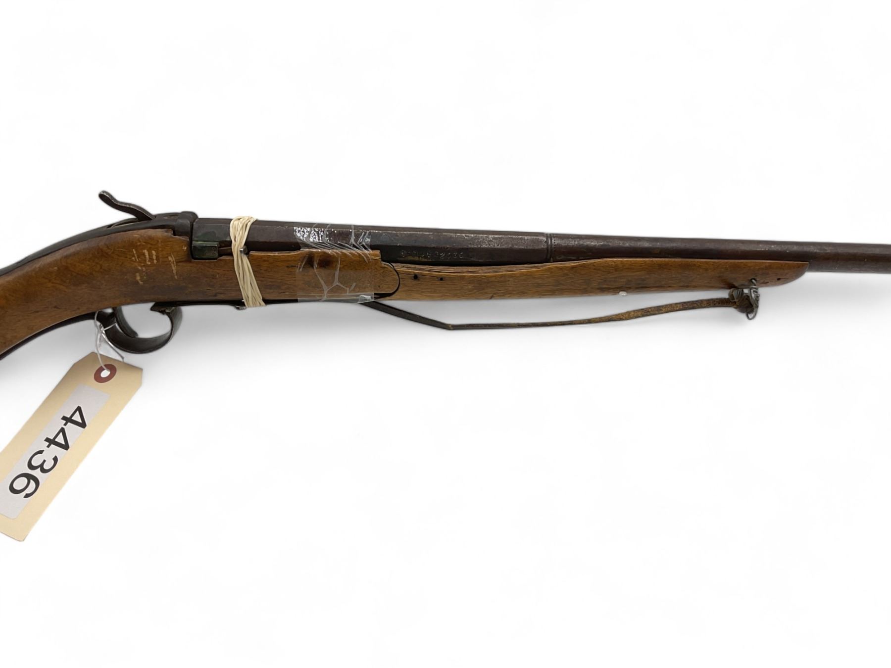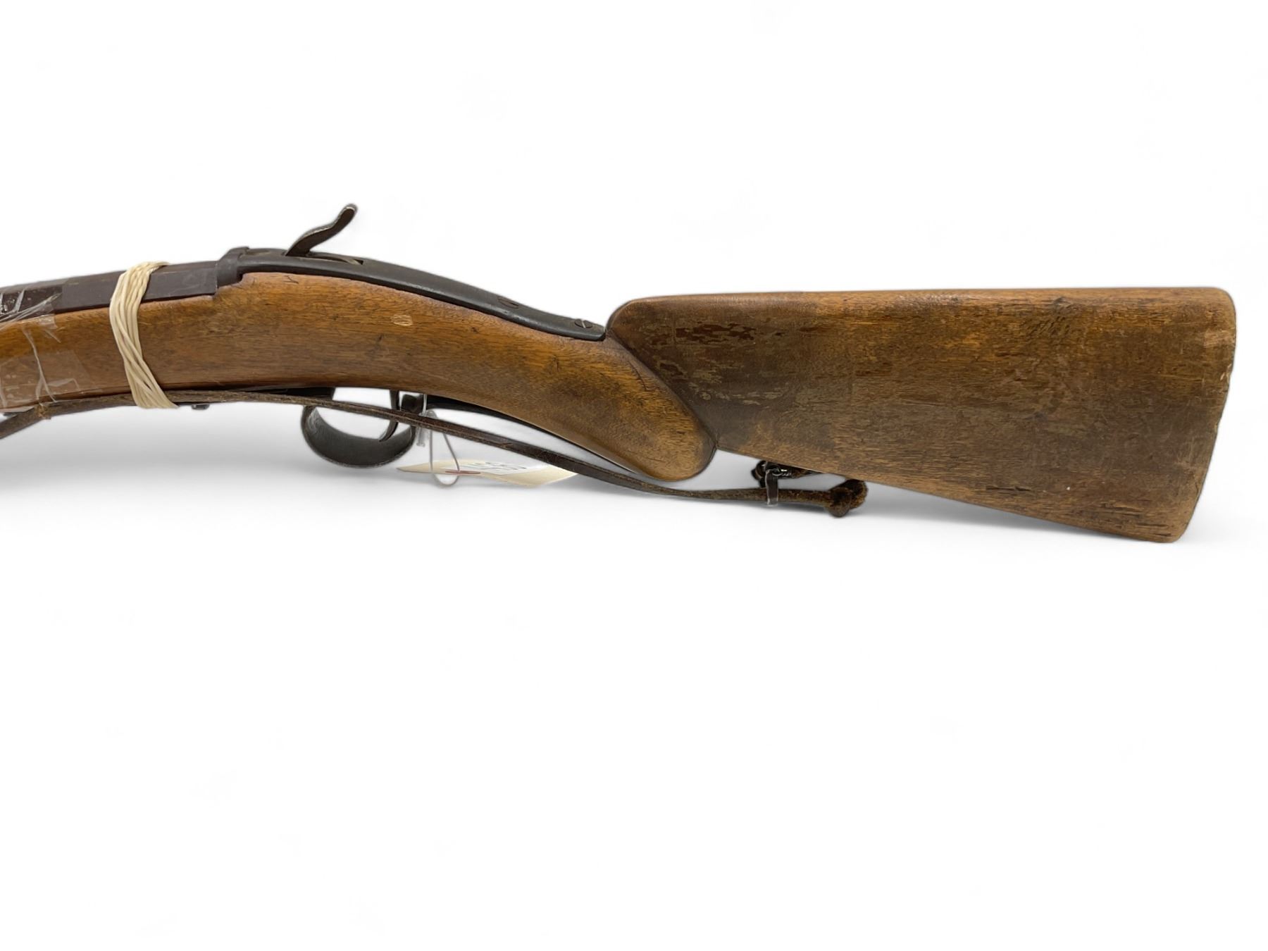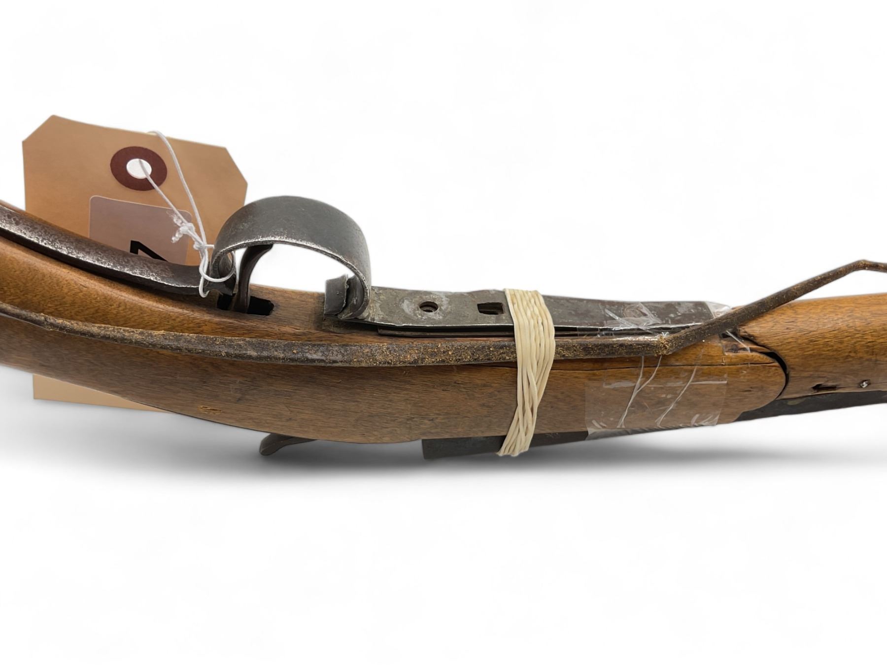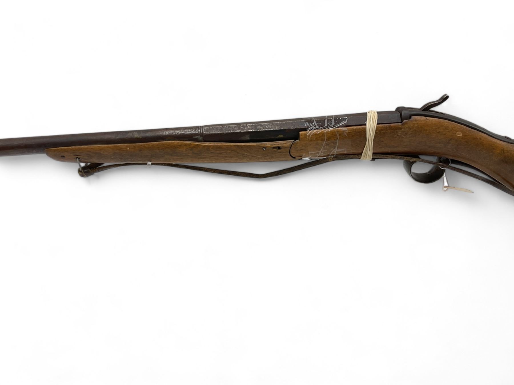 Unknown Single Shot Shotgun 28Ga 33" Barrel Wood Stock. Fixed choke, no sight. Wood forend and stock cracked and broken. Action does not lock shut; catch mechanism appears to be broken and missing parts. Trigger guard broken and welded; bottom metal bent and missing hardware. This is a non-restricted firearm.