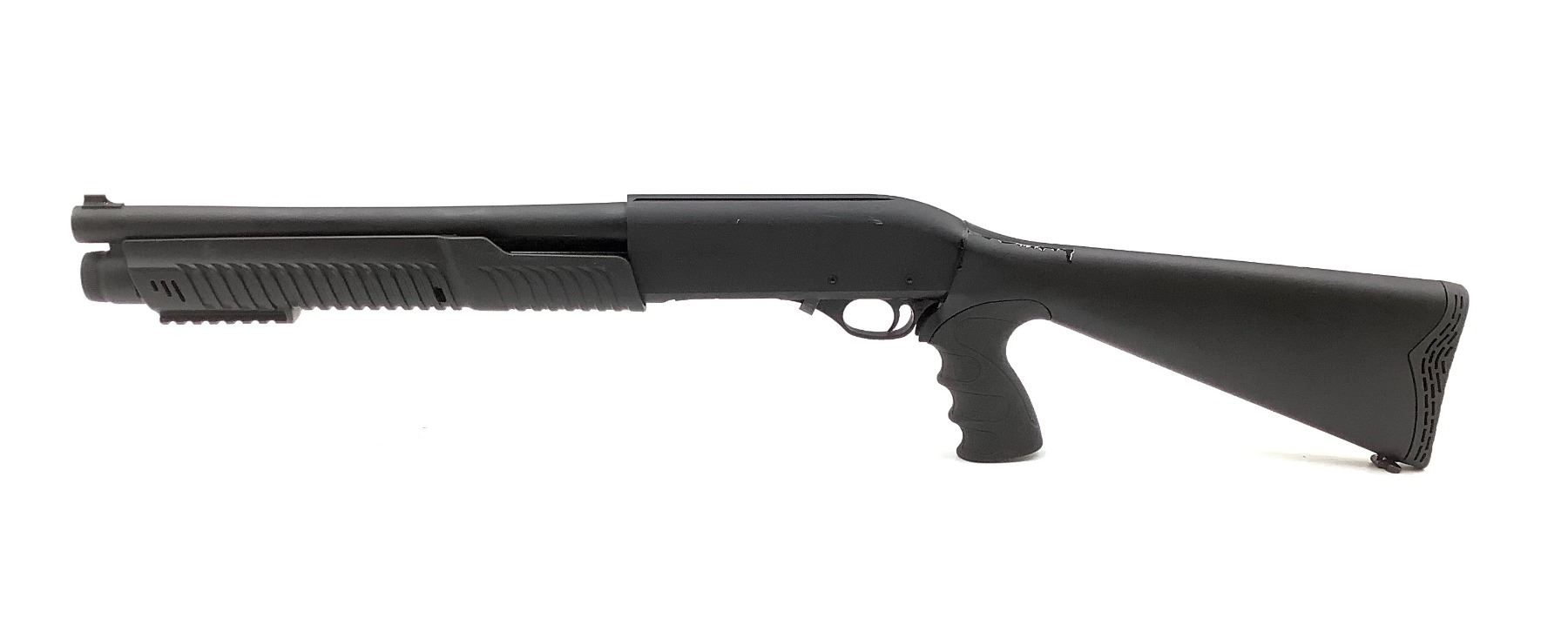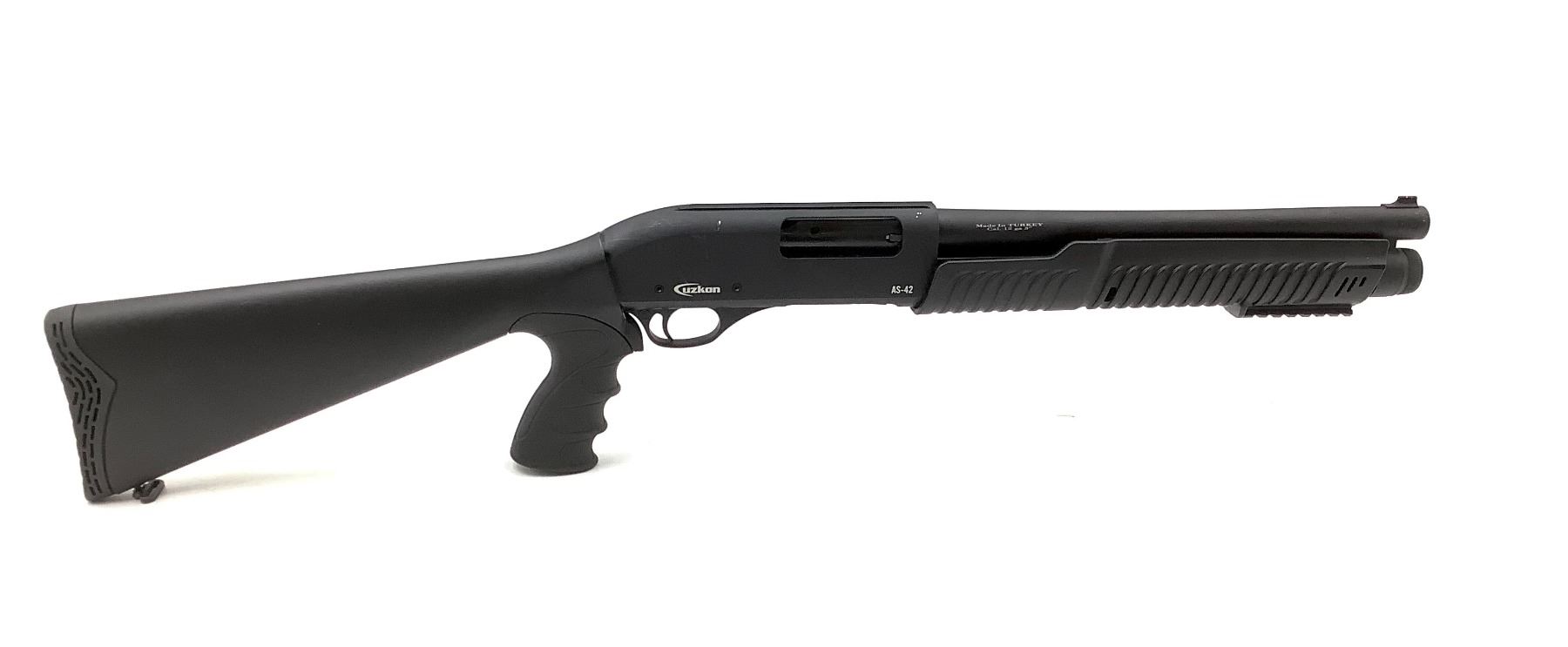 Uzkon AS-42 Pump Action Shotgun 12Ga 3" Chamber 14" Barrel Black Pistol Grip Synthetic Stock. Removable choke, rubber butt pad. This is a non-restricted firearm.