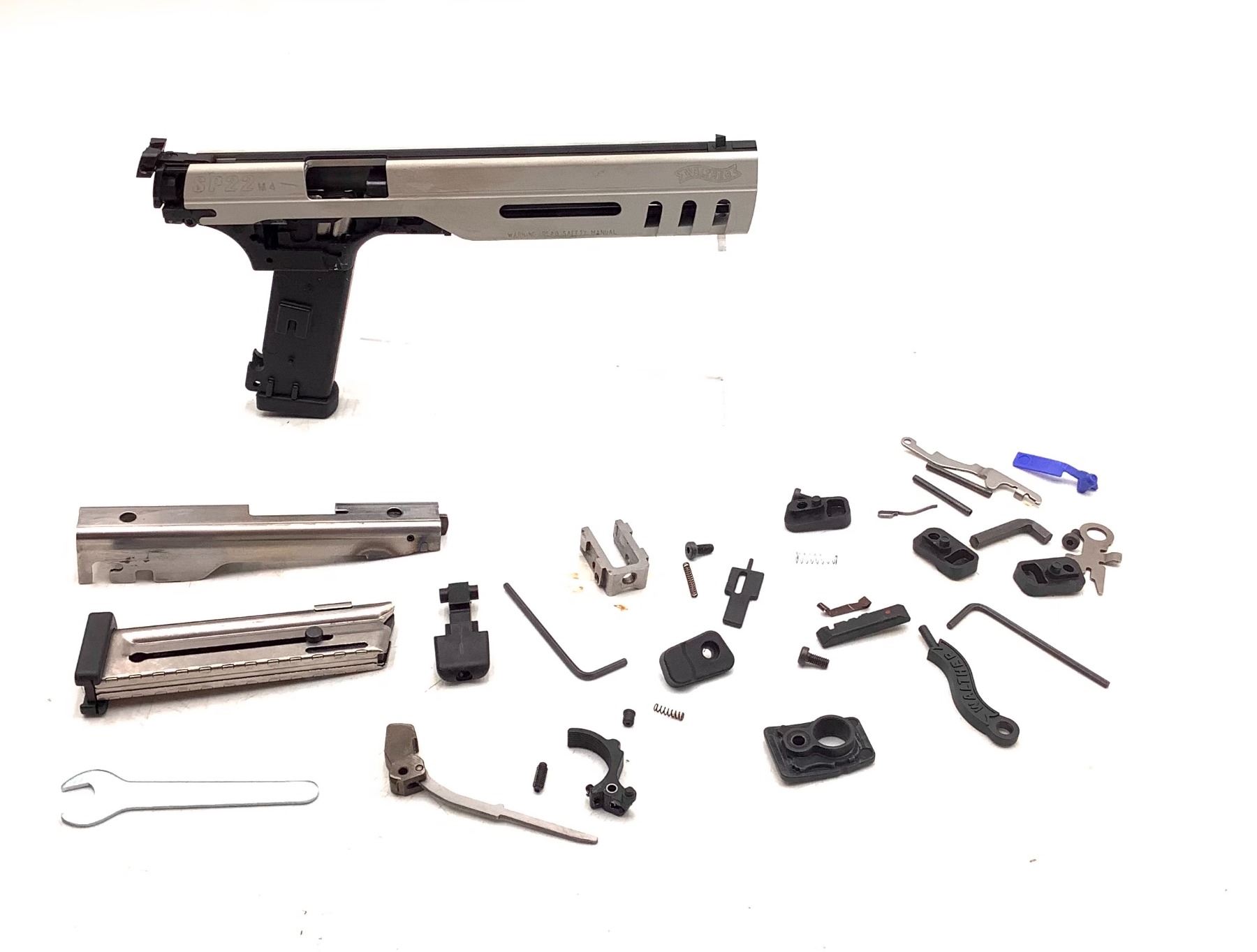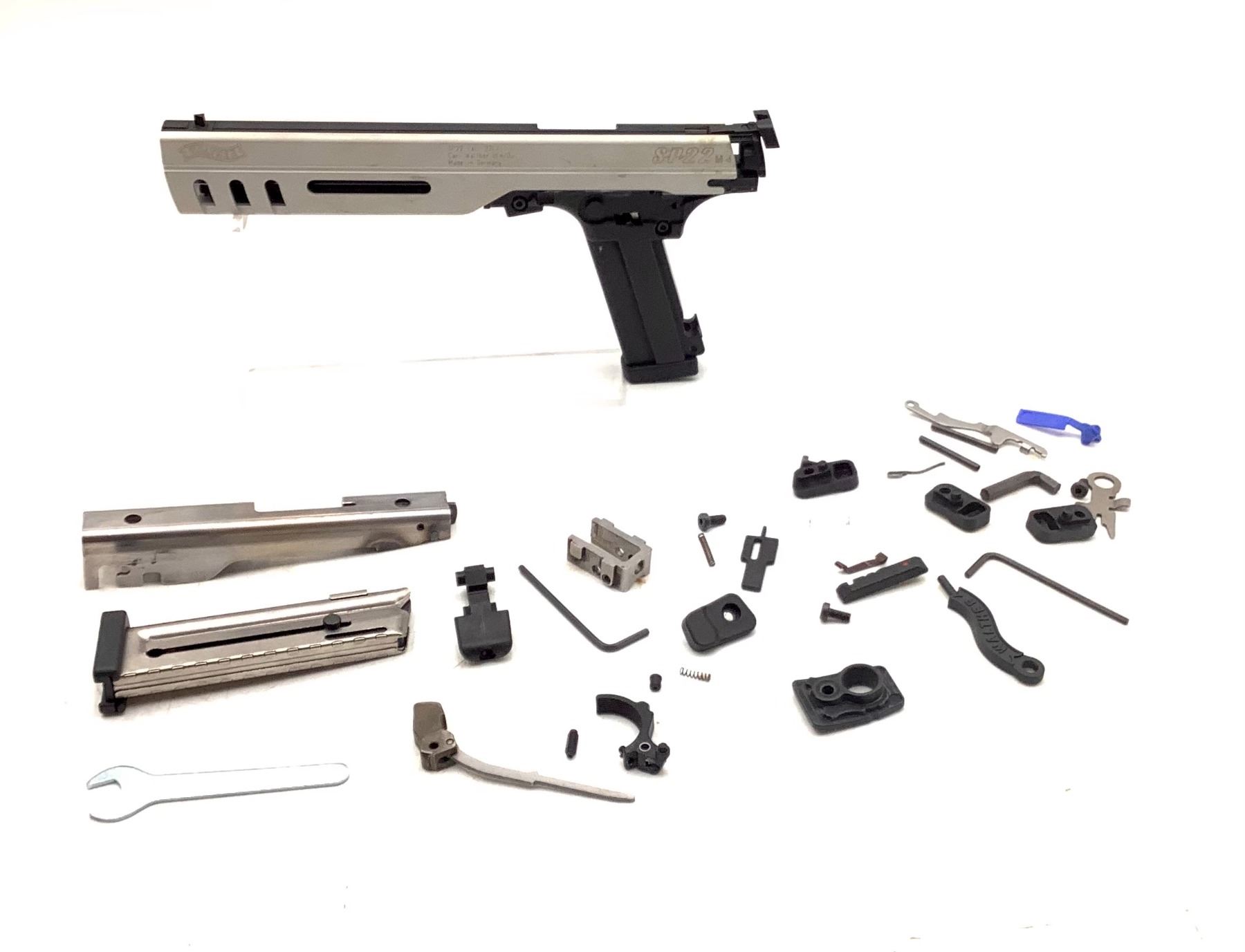 A used Walther SP22 Semi Auto Pistol 22LR Parts Gun, Restricted. Includes two magazines. Disassembled, missing rear sight, front cover and potentially other parts. This is a parts gun. This is a restricted firearm.