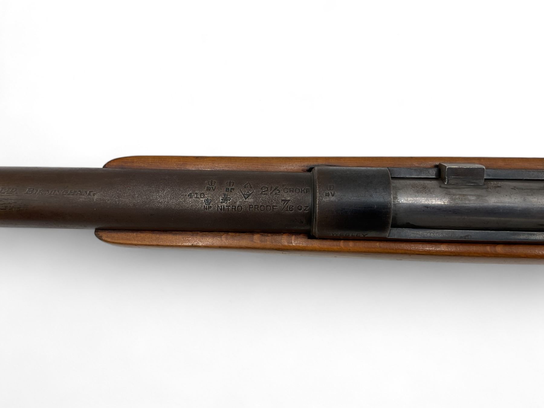 Webley And Scott Single Shot 410 Shotgun 2.5" Chamber 25" Barrel Wood Stock. Bead sight, fixed choke. This is a non-restricted firearm.