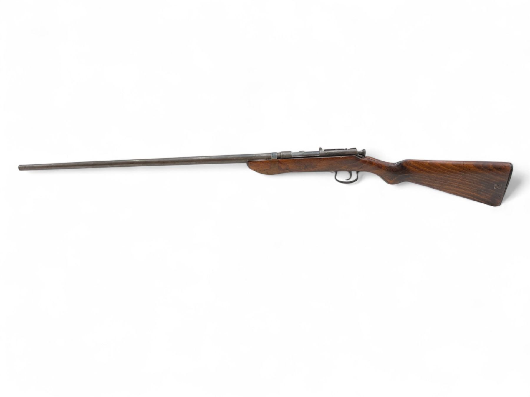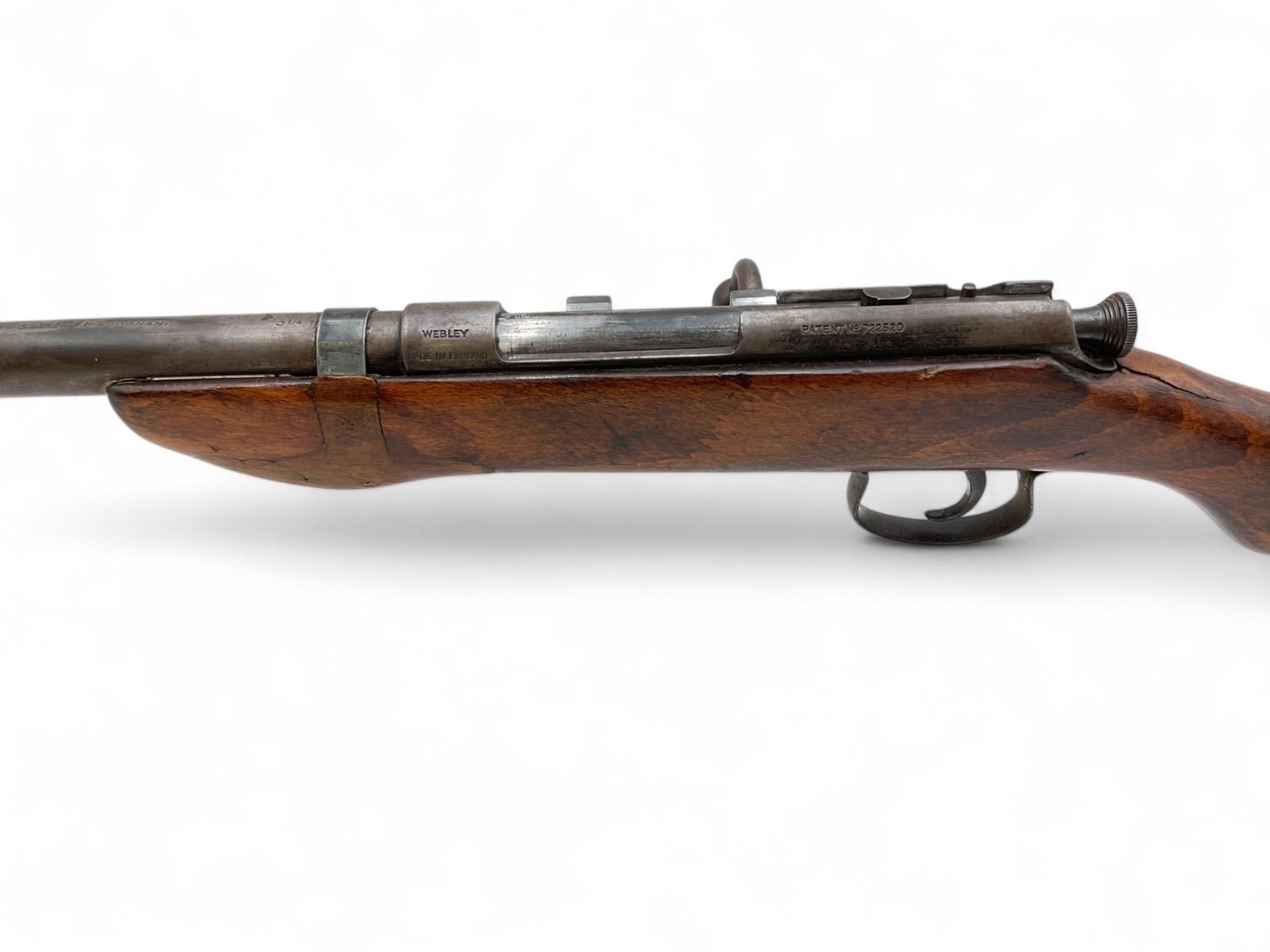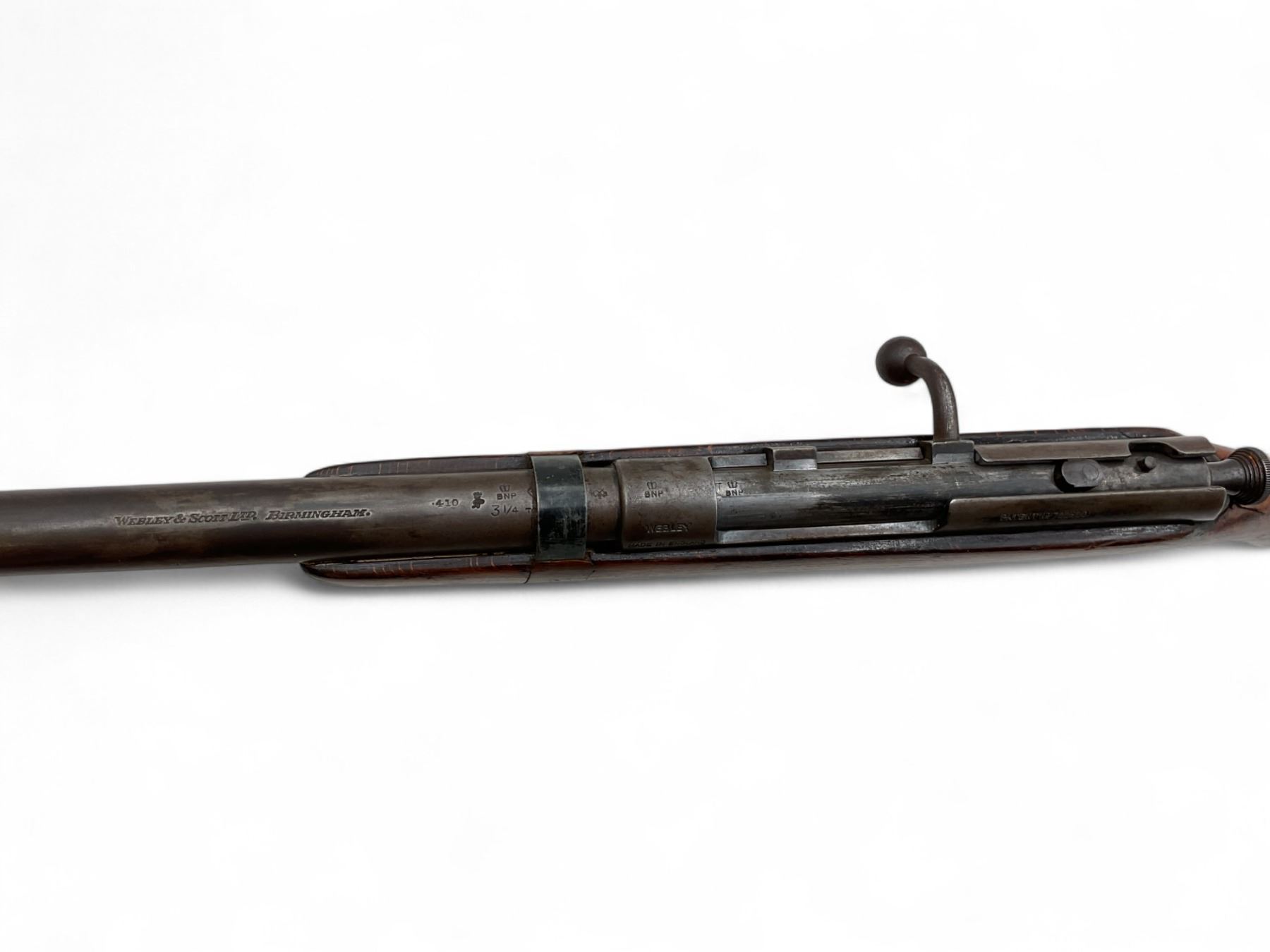 Webley And Scott Single Shot Bolt Action 410 Shotgun 25" Barrel Wood Stock. Bead sight, fixed choke. Wood stock has been modified at front; stock is cracked at rear by receiver. Plastic butt plate broke at bottom. This is a non-restricted firearm.