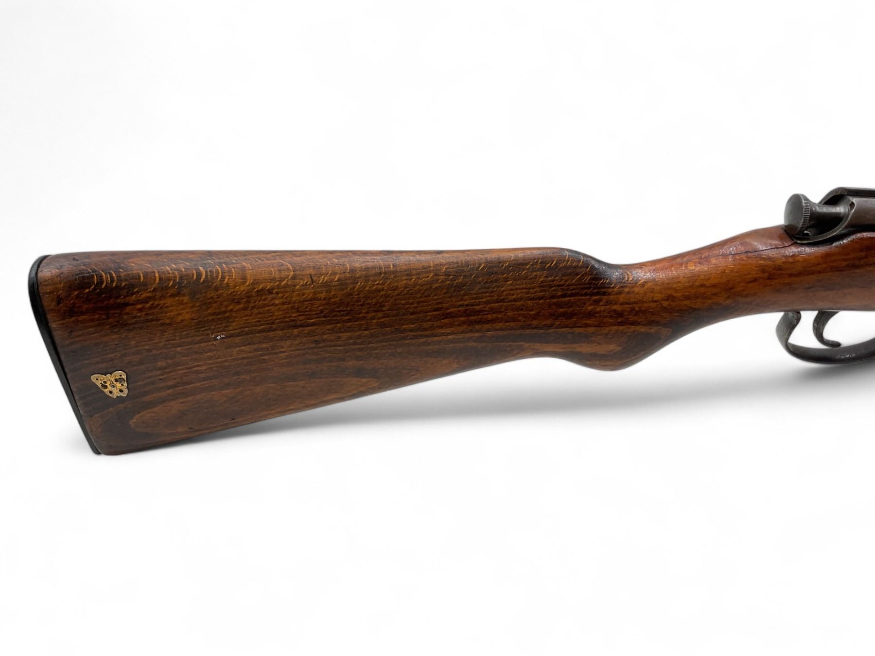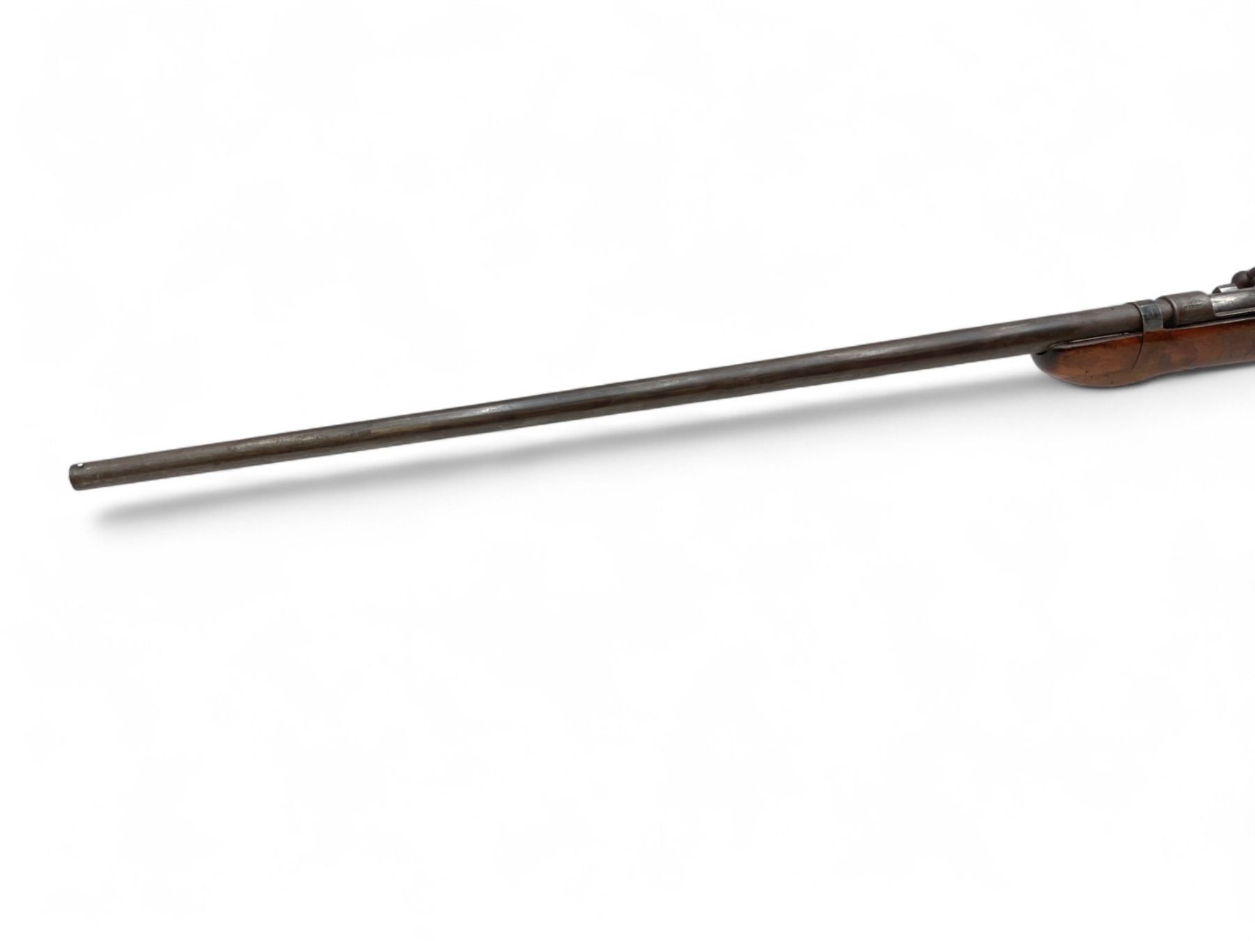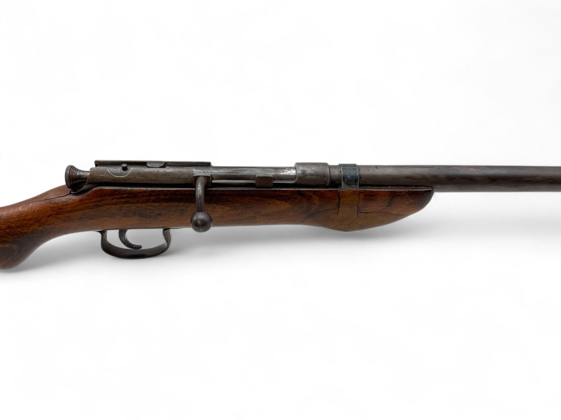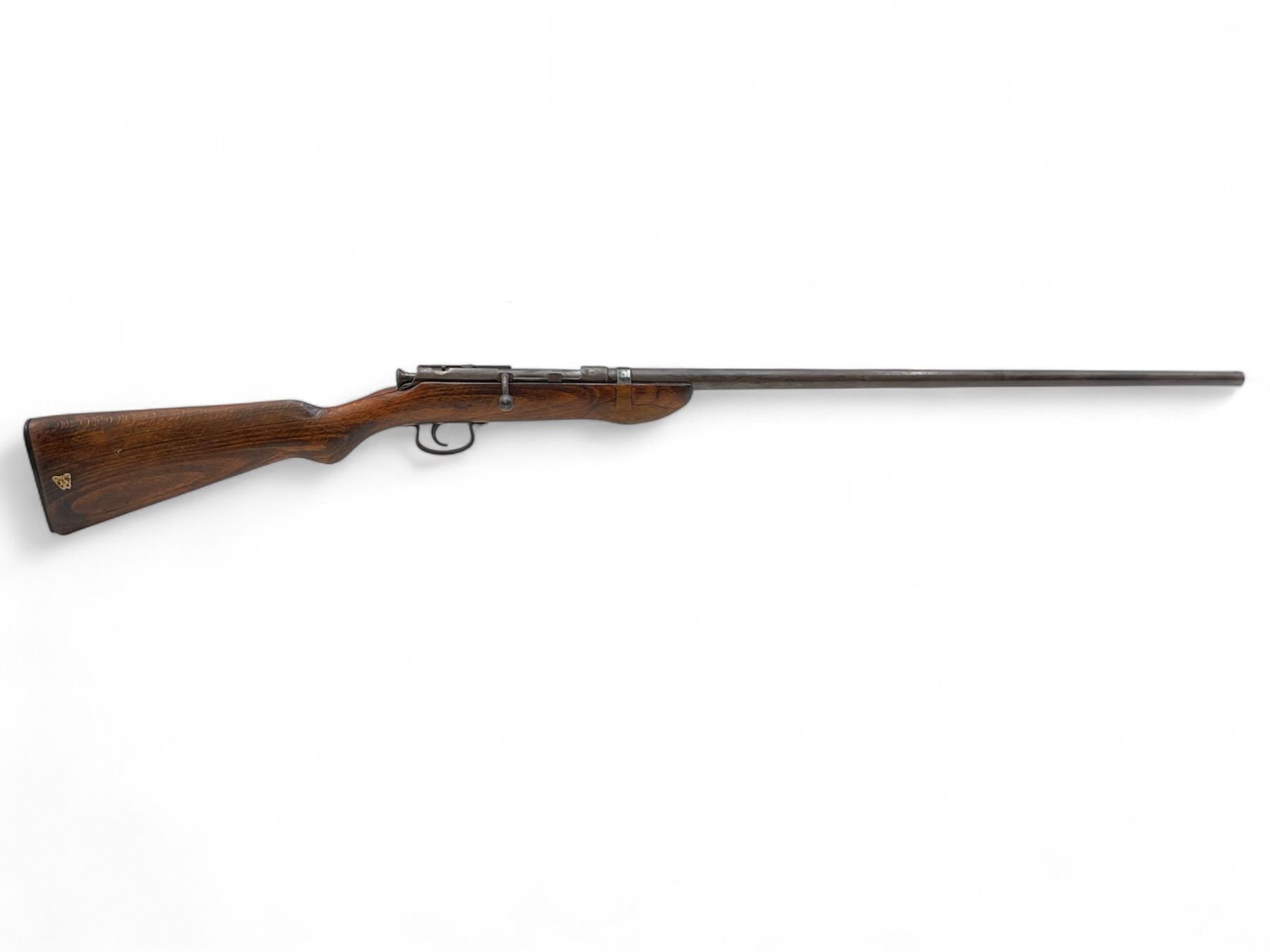 Webley And Scott Single Shot Bolt Action 410 Shotgun 25" Barrel Wood Stock. Bead sight, fixed choke. Wood stock has been modified at front; stock is cracked at rear by receiver. Plastic butt plate broke at bottom. This is a non-restricted firearm.