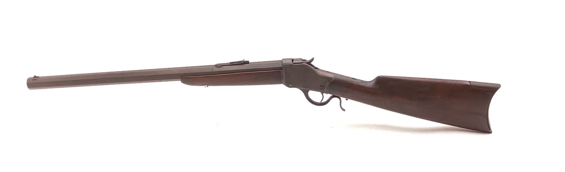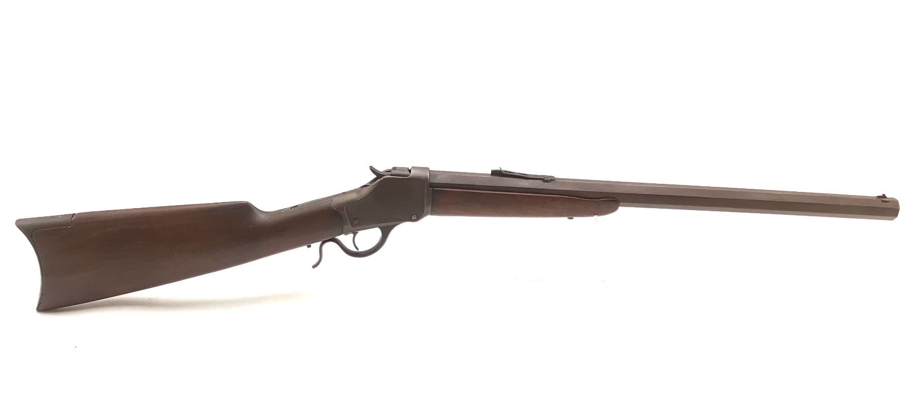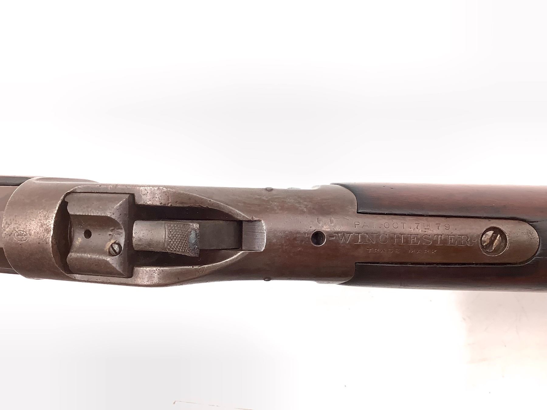 A used Winchester 1885 High Wall single-shot falling-block rifle, 21" heavy octagonal chambered in 32-40 Winchester. Bore is heavily pitted from firing black powder ammunition. Serial number is 100888, the last serial number recorded between 1913 and the end of 1923 was 100352 at the end of 1913. Rear sight is a worn homemade replacement. Wood stock has cracks, nicks and scratches and the buttplate is loose. Metal finish is has gone to patina overall. The firing pin has been removed but is included with it.