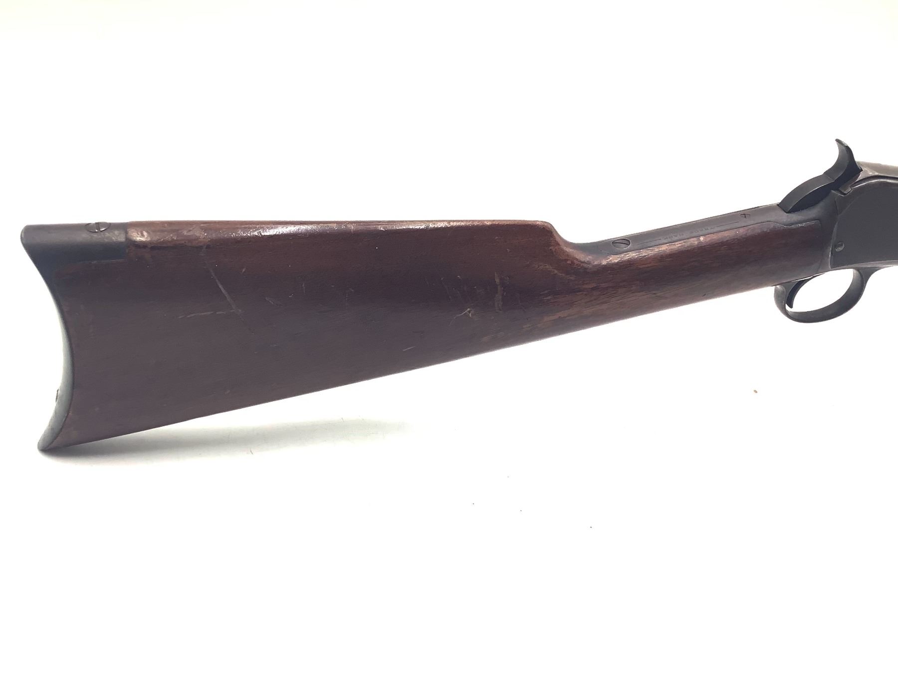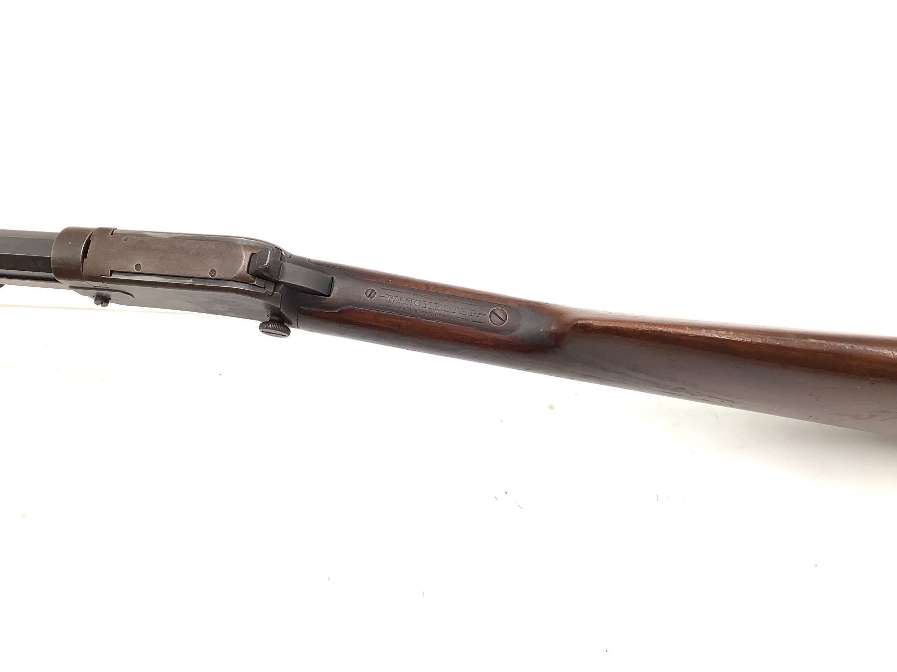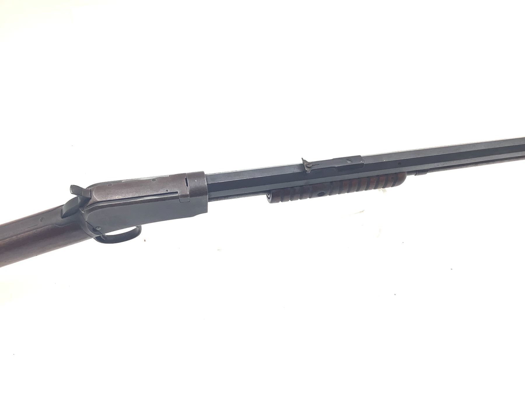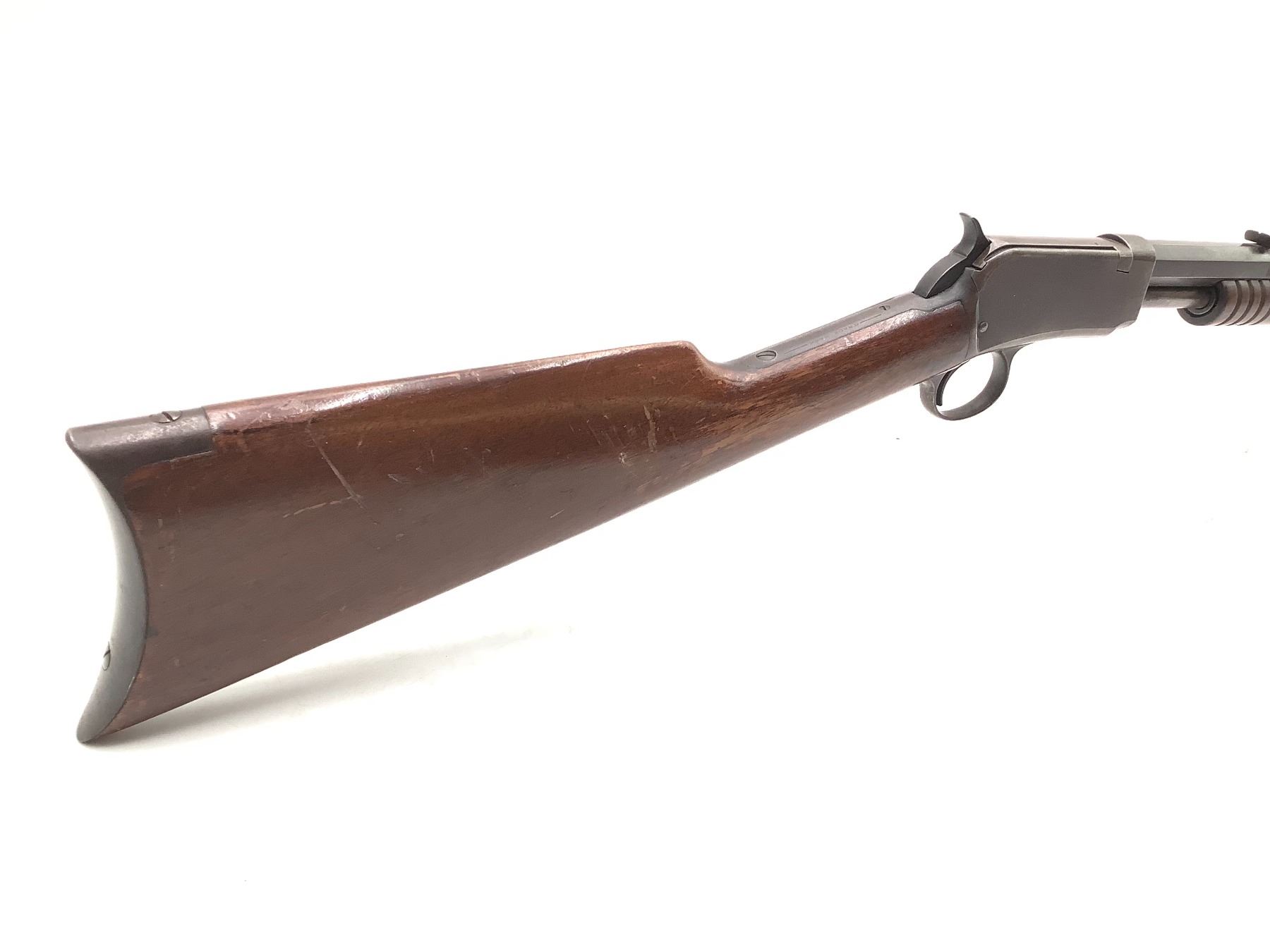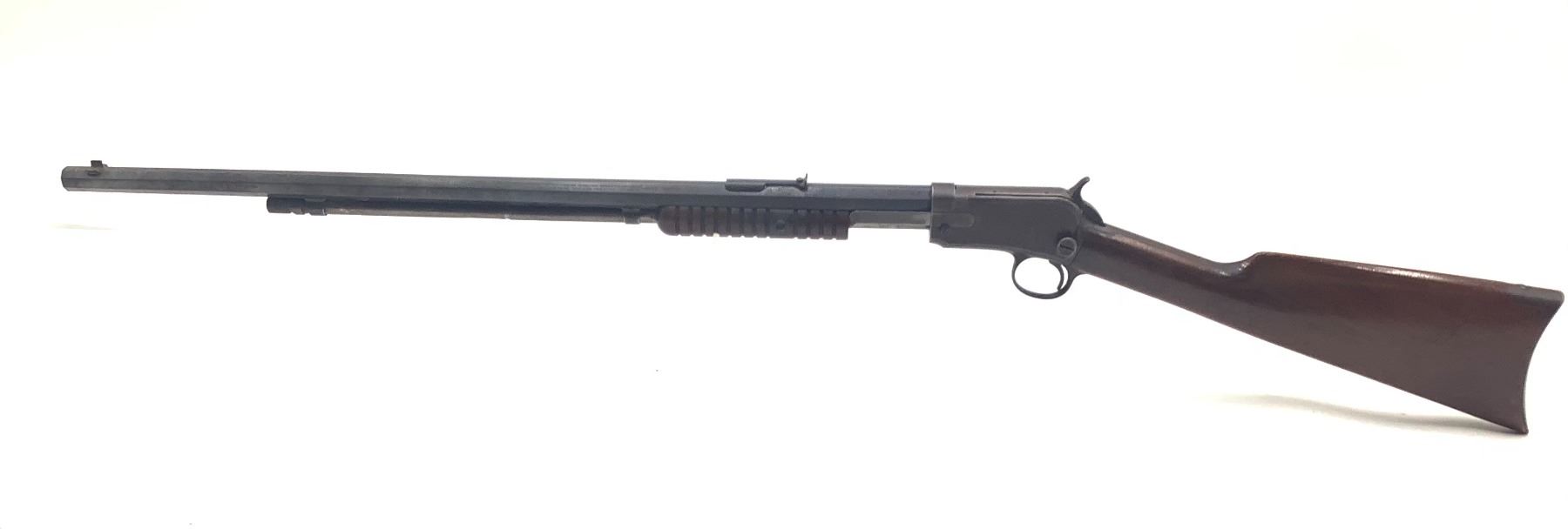 Winchester 1890 Pump Action 22 WRF 24" Barrel Wood Stock. Fixed sights, tube magazine, worn rifling. Serial number 572639. This is a non-restricted firearm.