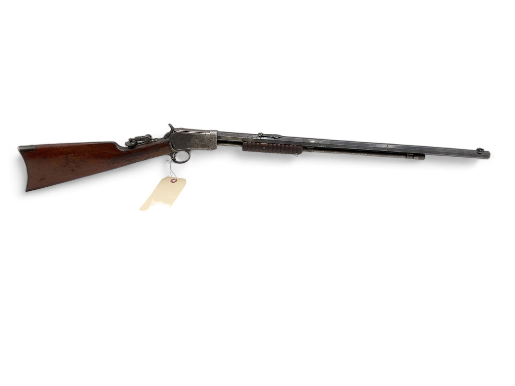 Winchester Model 1890 Pump Action Rifle 22 WRF 24" Barrel Wood Stock. Peep sights, steel butt plate. Serial number 499201. This is a non-restricted firearm.