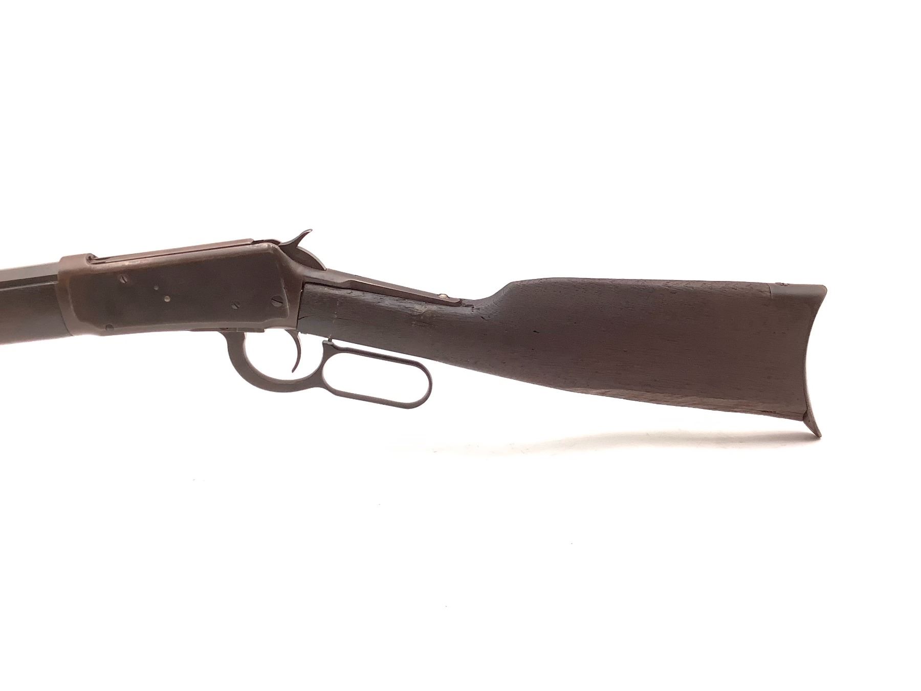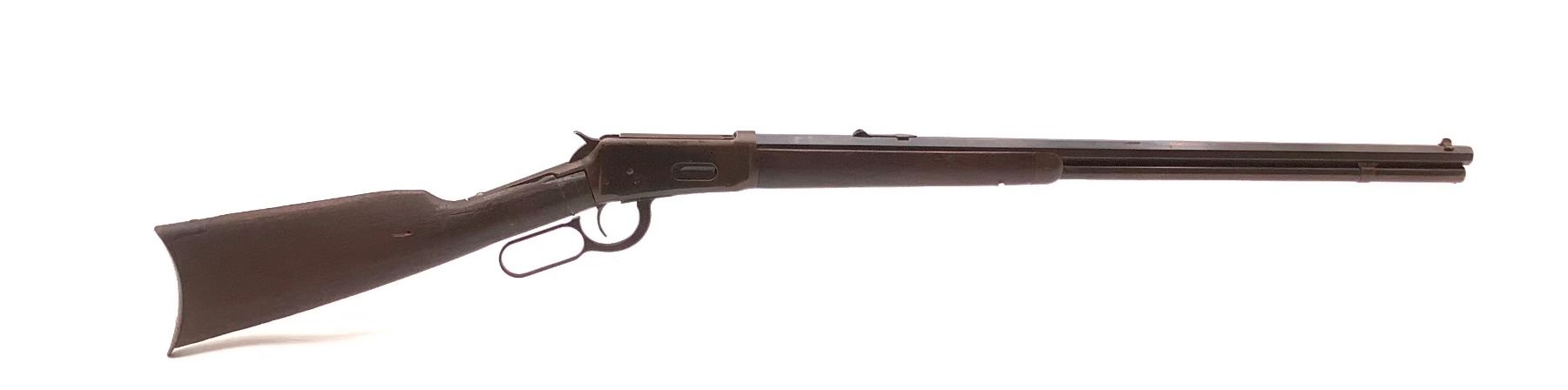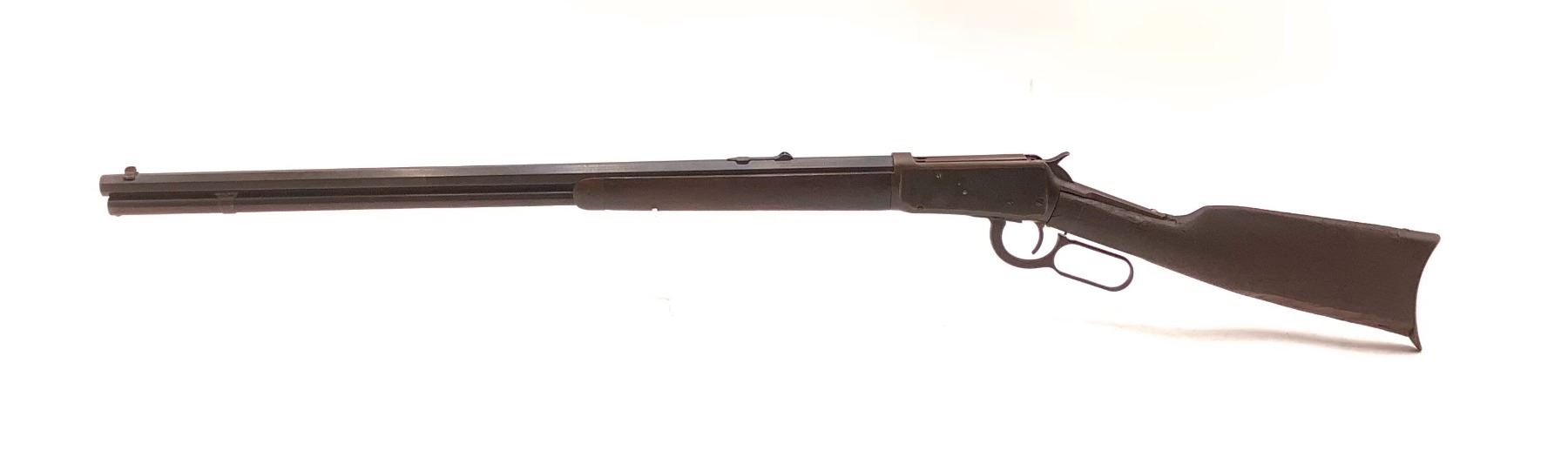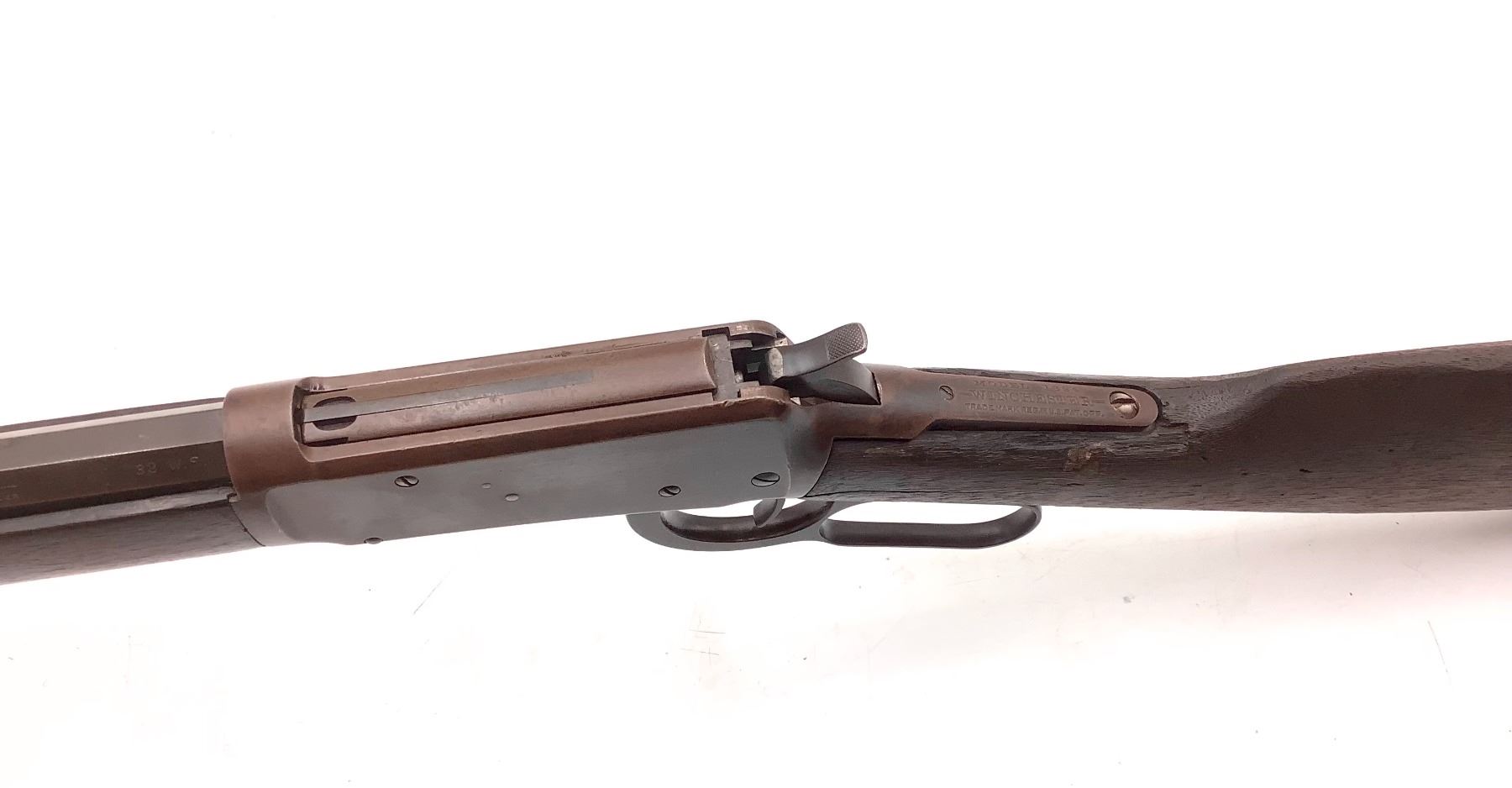 Winchester Model 1894 Lever Action Rifle 32 WS 26" Octagon Barrel. Serial number 463841. Front and rear sights present. Wood stock in rear missing piece, remainder is cracked and scratched. Front wood forend has scratches and nicks. Metal finish is worn. This is a non-restricted firearm.