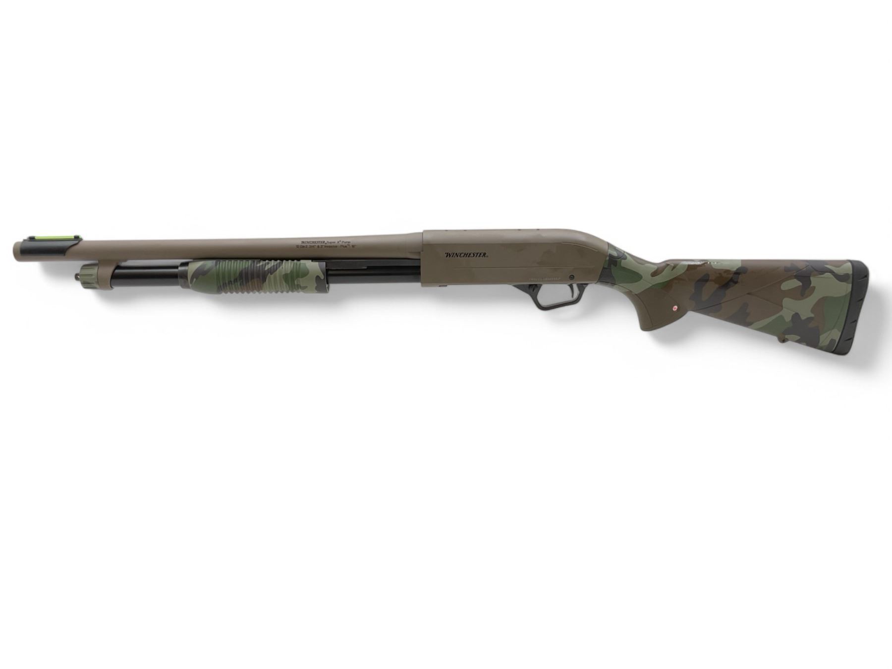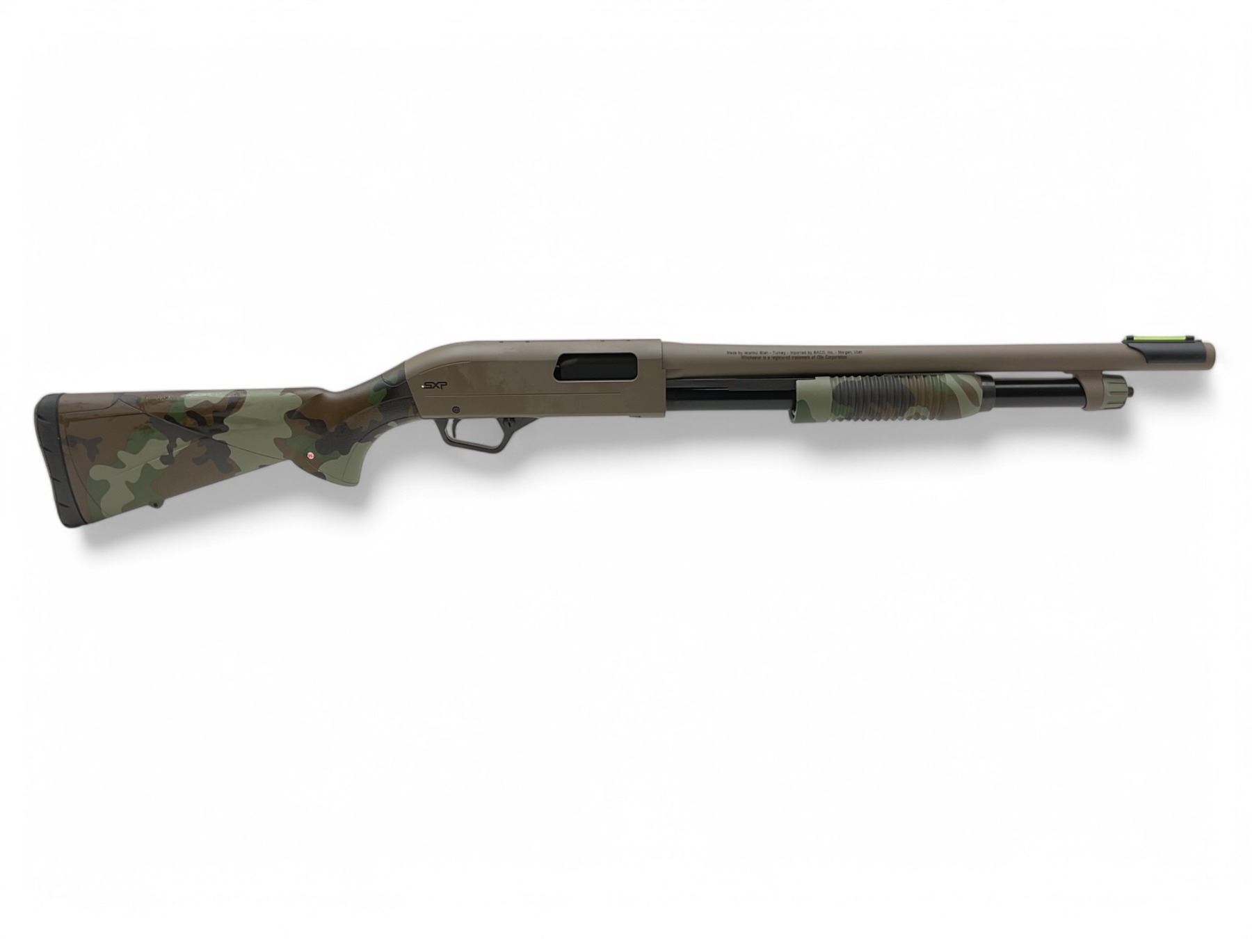 Winchester SXP Woodland Defender Pump Action Shotgun 12Ga 3" Chamber 18" Barrel FDE And Camo, New. Fiber optic sight; comes with a removable choke. This is a non-restricted firearm.