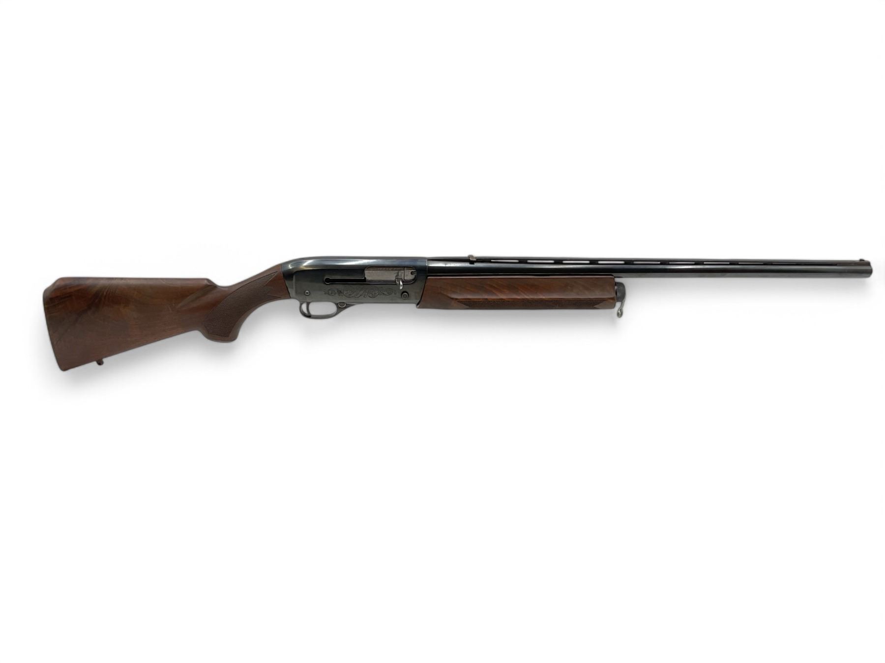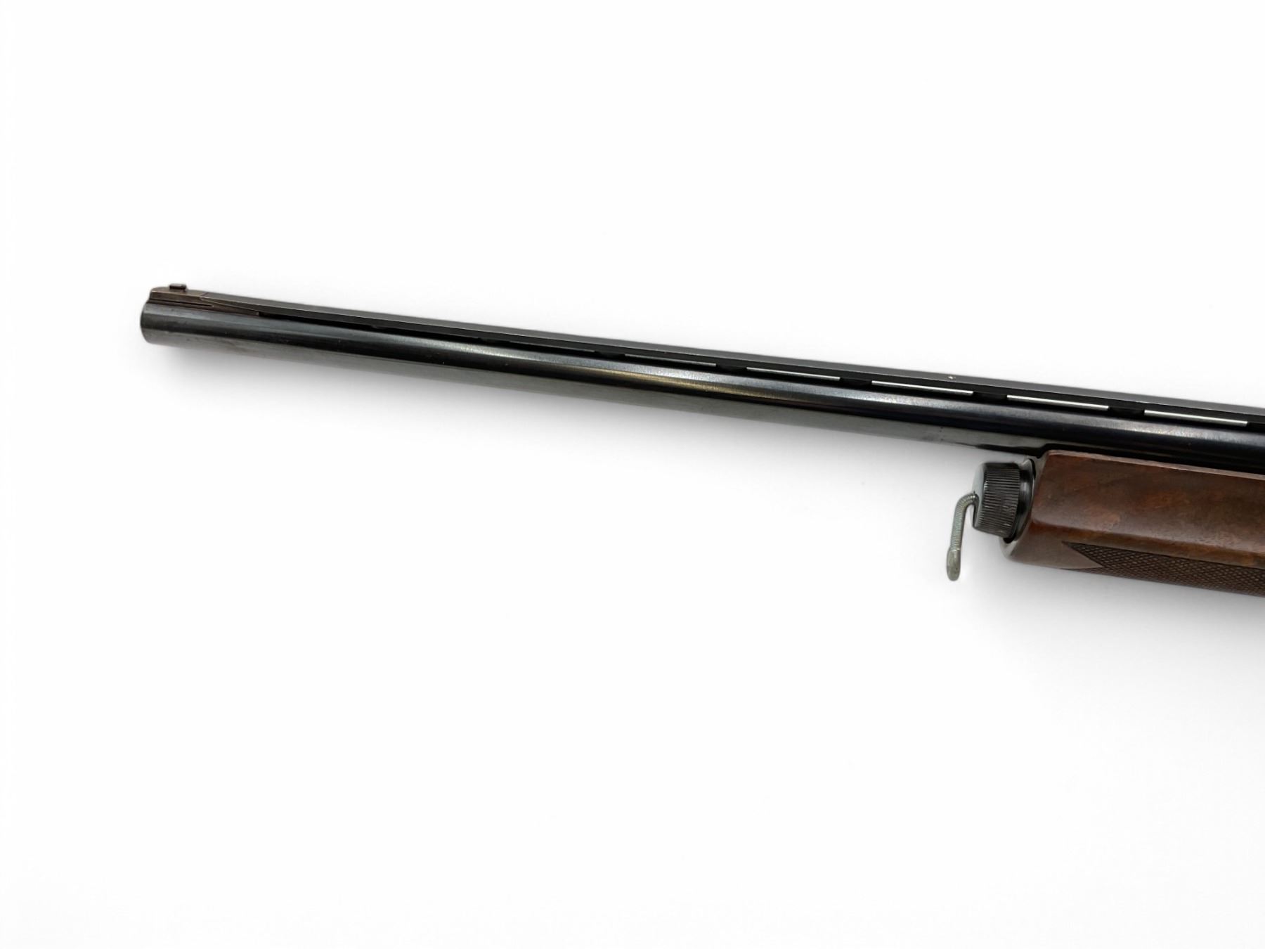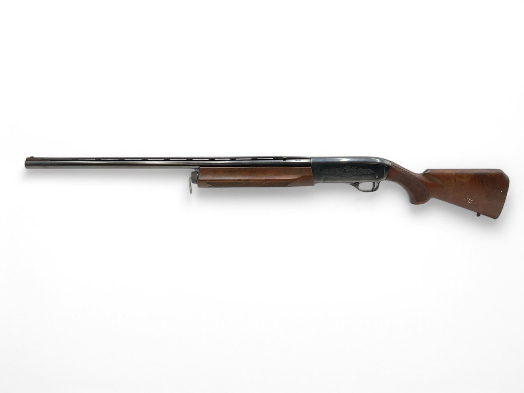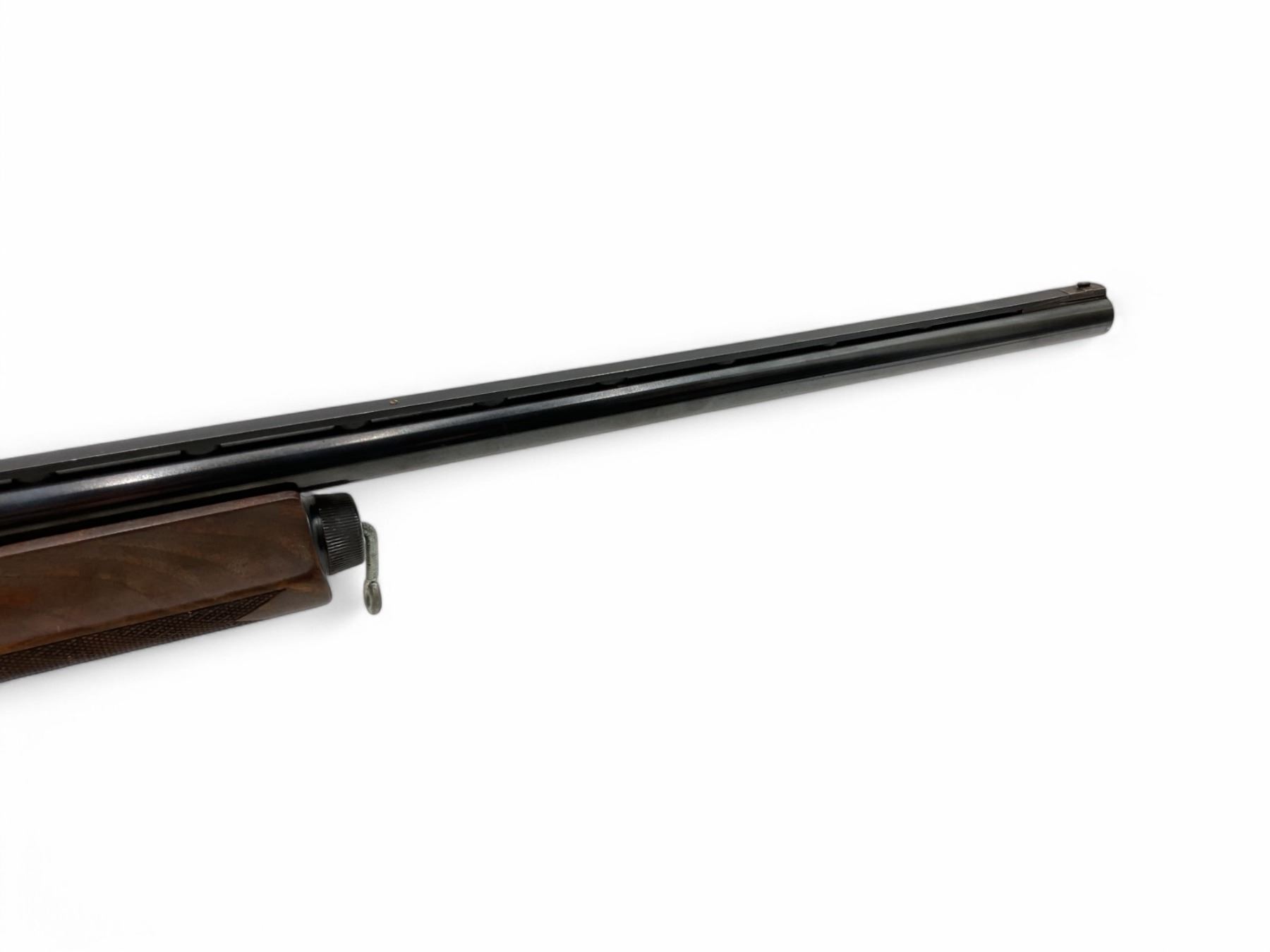 Winchester Super-X Model 1 Semi Auto Shotgun 12Ga 2.75" Chamber 26" Vent Rib Barrel Wood Stock. Fixed choke; missing butt pad on rear stock. Fold down rear sight, fixed front sight. Custom front sling mount. This is a non-restricted firearm.