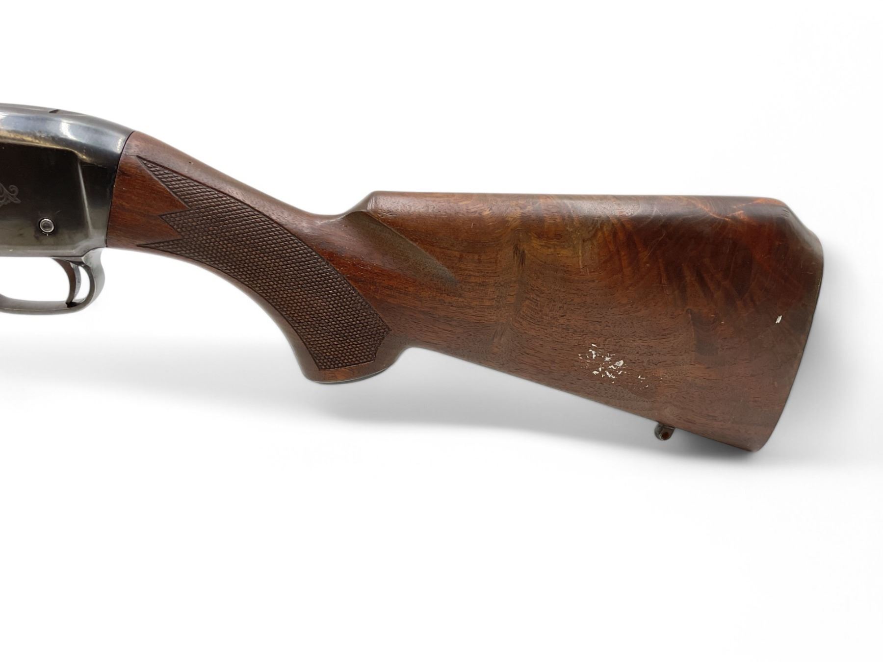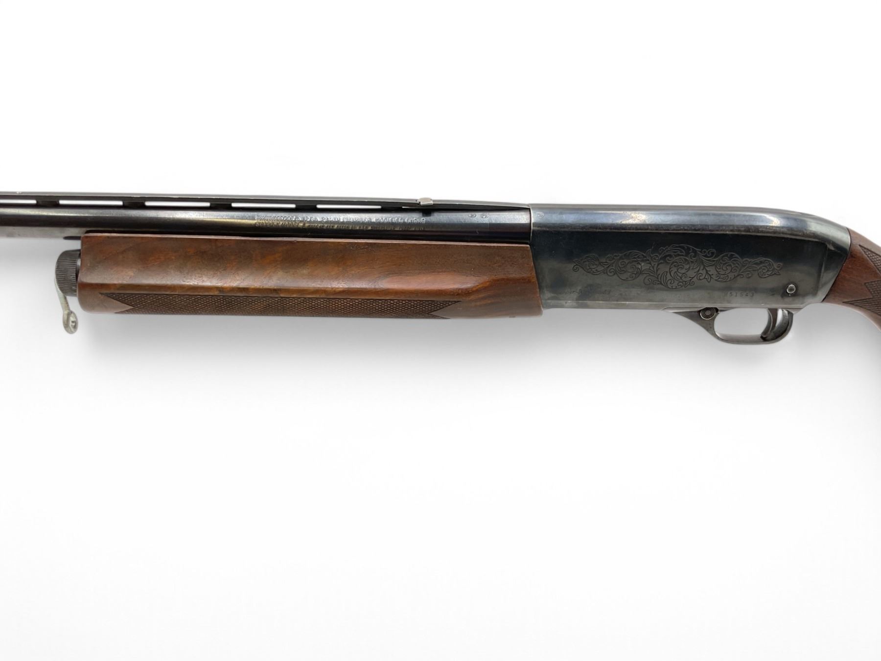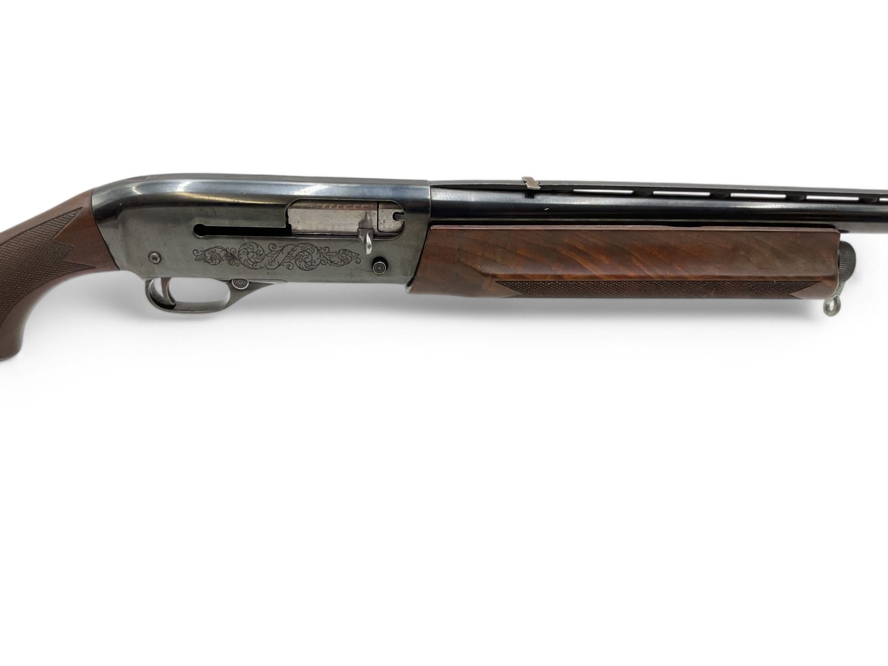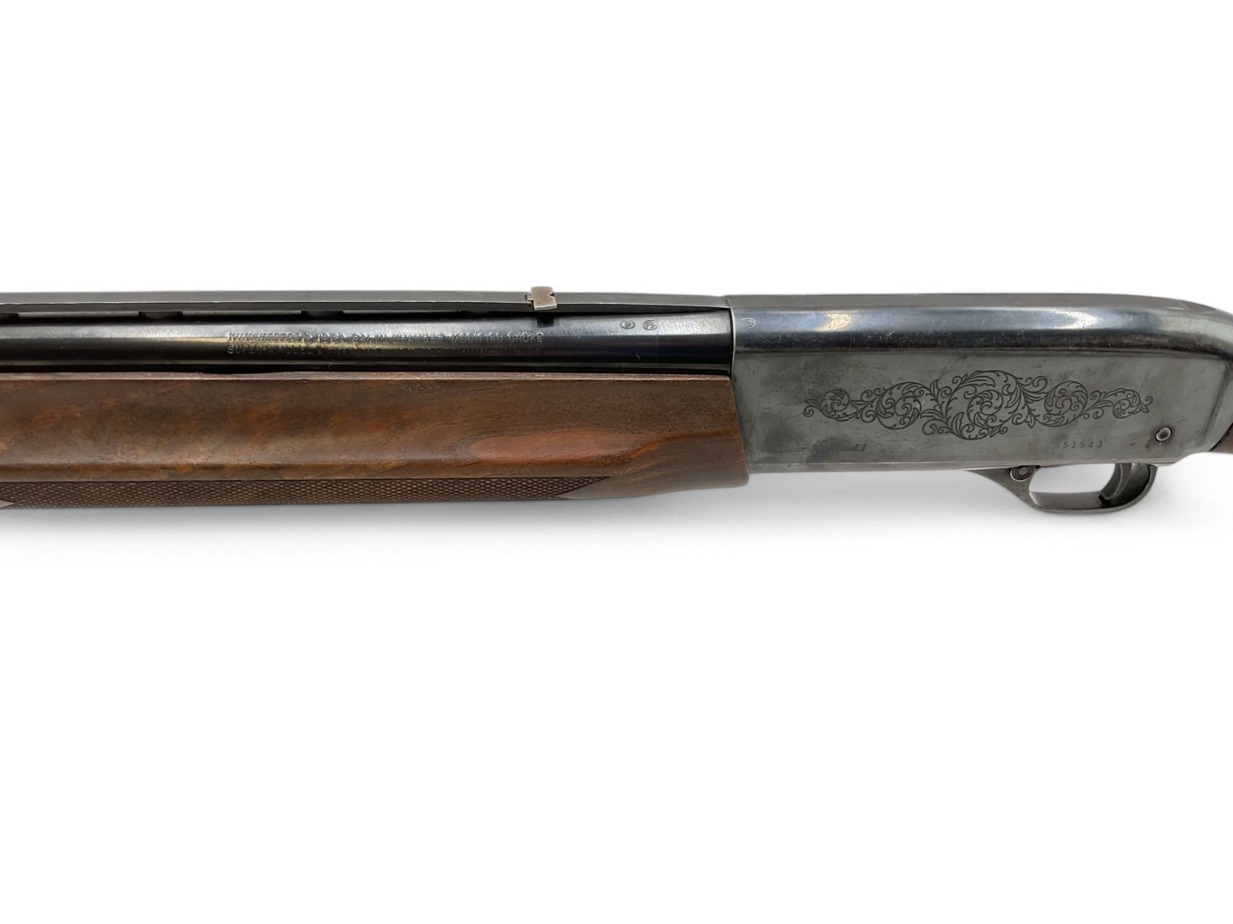 Winchester Super-X Model 1 Semi Auto Shotgun 12Ga 2.75" Chamber 26" Vent Rib Barrel Wood Stock. Fixed choke; missing butt pad on rear stock. Fold down rear sight, fixed front sight. Custom front sling mount. This is a non-restricted firearm.