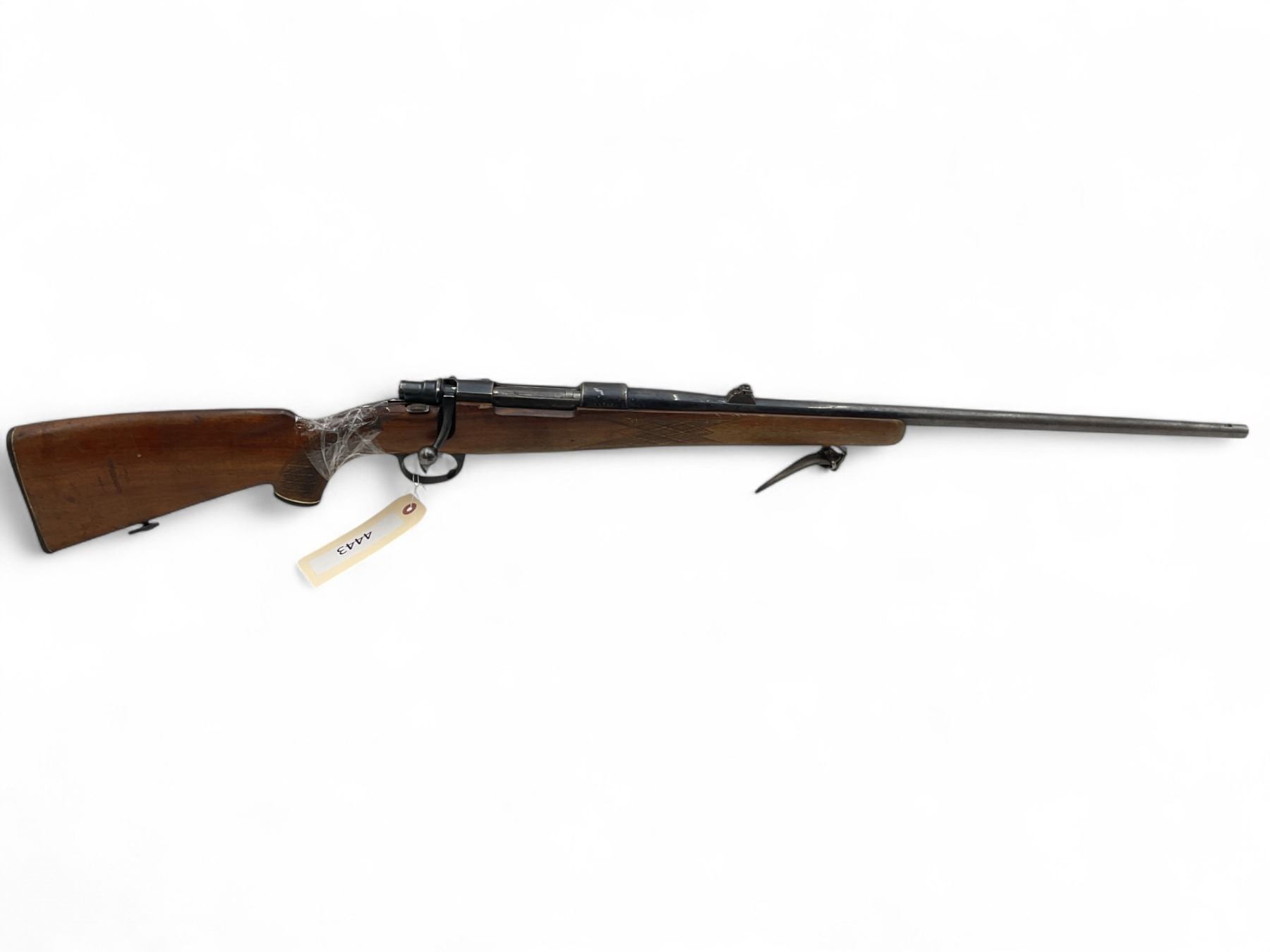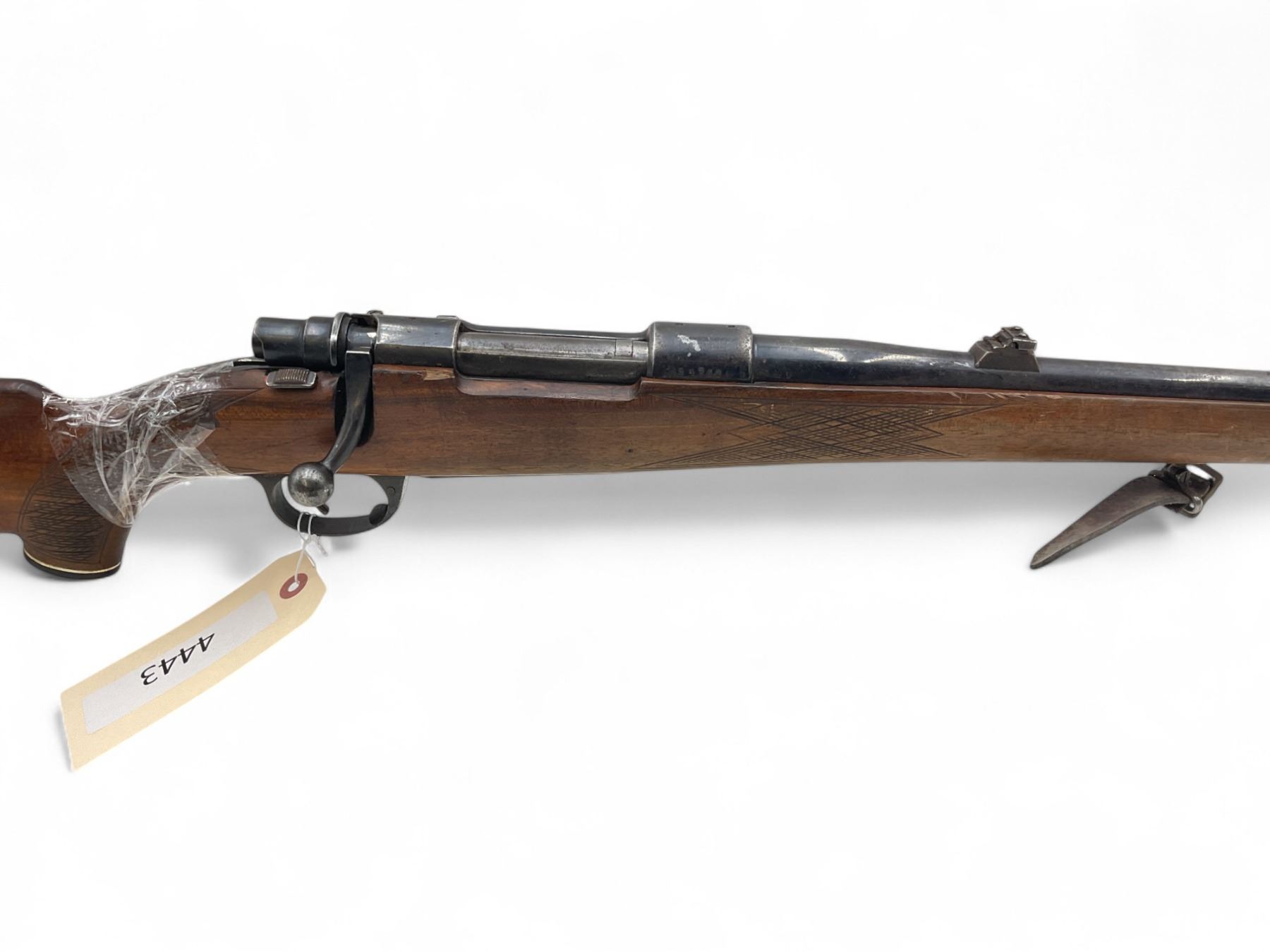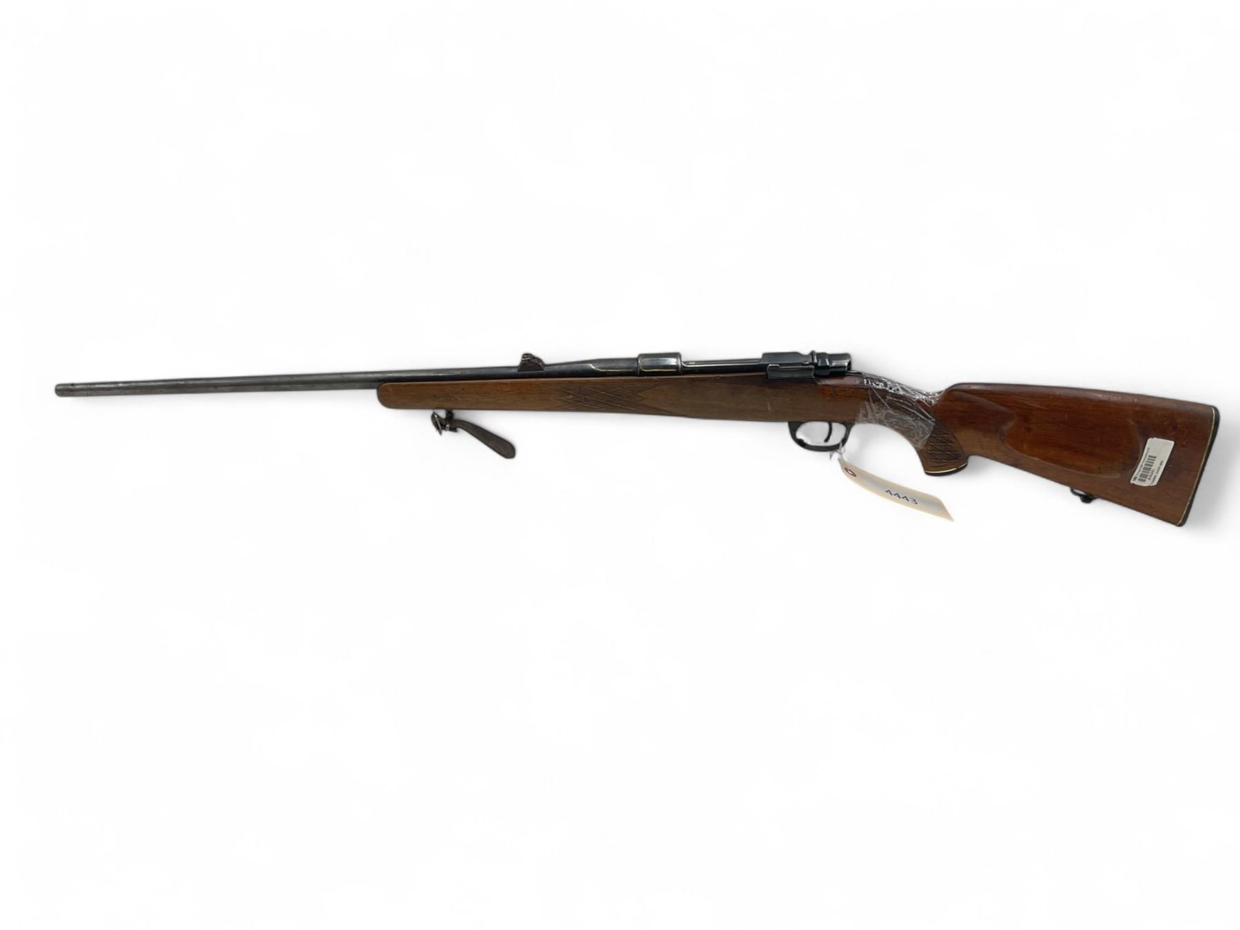 Zastava Mauser Bolt Action Rifle 8X57JS 24" Barrel Wood Stock. Internal magazine with hinged base plate; magazine follower bent and missing section which prevents bolt from cycling. No front sight present; flip up rear sight. Rear stock has substantial crack at receiver and has been taped. This is a non-restricted firearm.